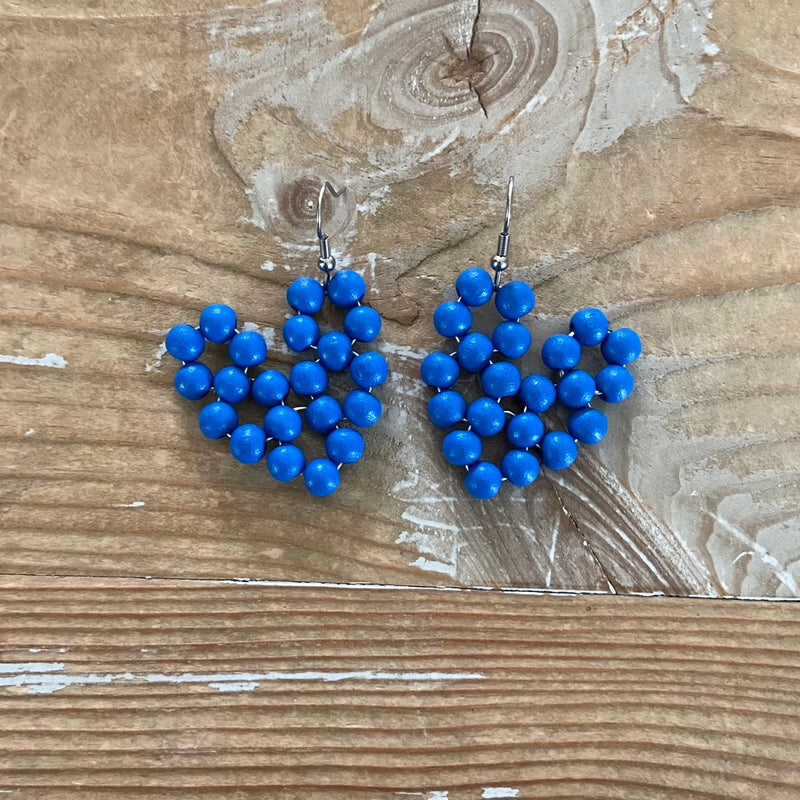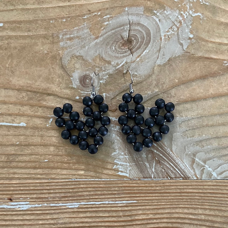 Rakkautta on-korvakorut rakkaalle, itselle, ystävälle! Puuhelmistä ja metallilangasta punottujen Rakkautta on-korvakorujen helmet ovat maalattuja ja lakattuja. Koukuissa on käytetty kirurginterästä. Korvakorujen pituus koukun kanssa on n. 5 cm ja leveys n. 3,5 cm. Korvakorupari on kiinnitetty uusiokartonkiseen tuotelappuun.