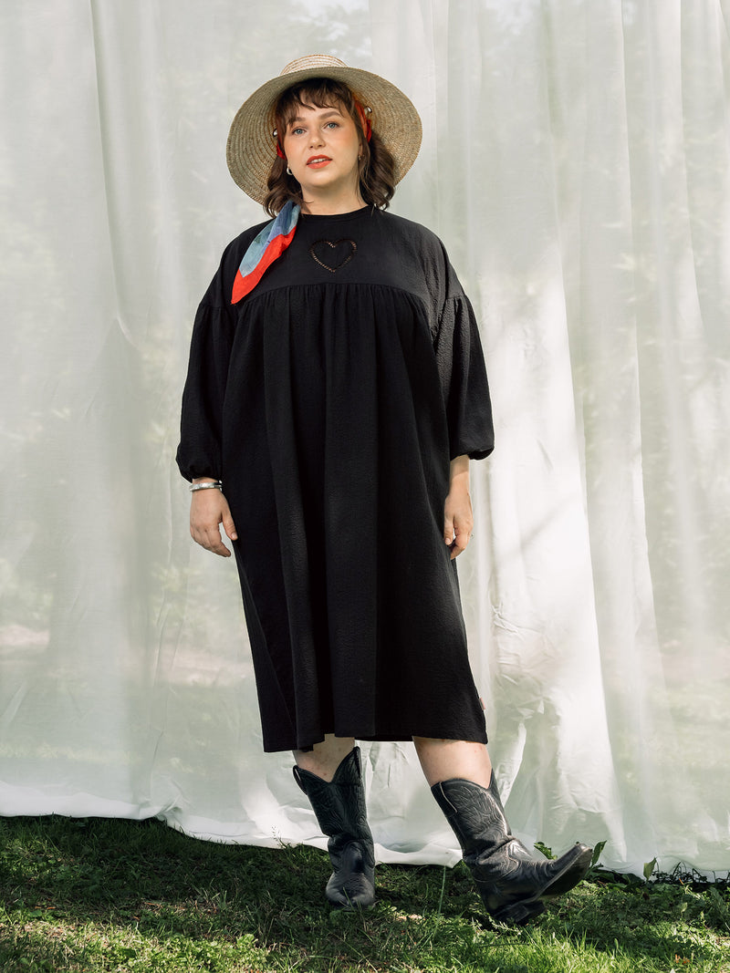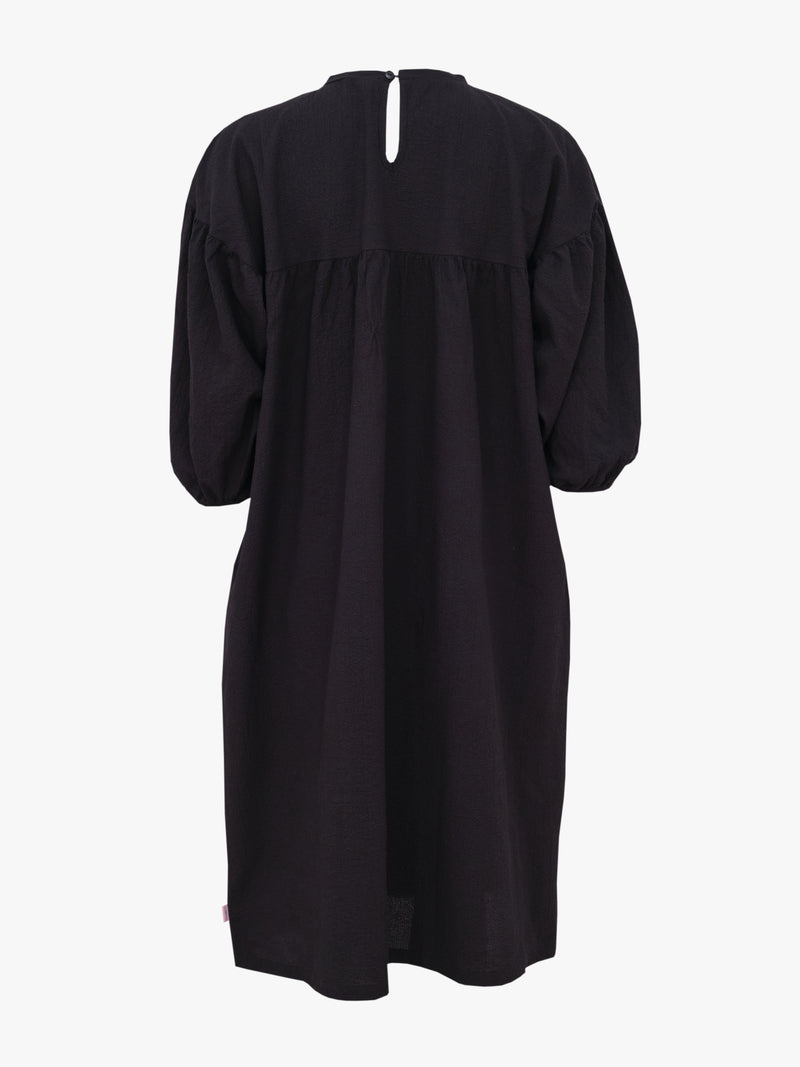 Evelyn mekko on mukavan rento valinta arkeen ja juhlaan! Mekon materiaali on ihanan kevyttä seersucker -puuvillakreppiä. Kangas ei juurikaan jousta. Mekossa on kauniit, puhvimaiset hihat ja hihansuissa ohut kuminauha. Hihat ovat hieman vajaamittaiset. Rinnassa yksityiskohtana suloinen sydän-brodeeraus. Niskassa nappikiinnitys.