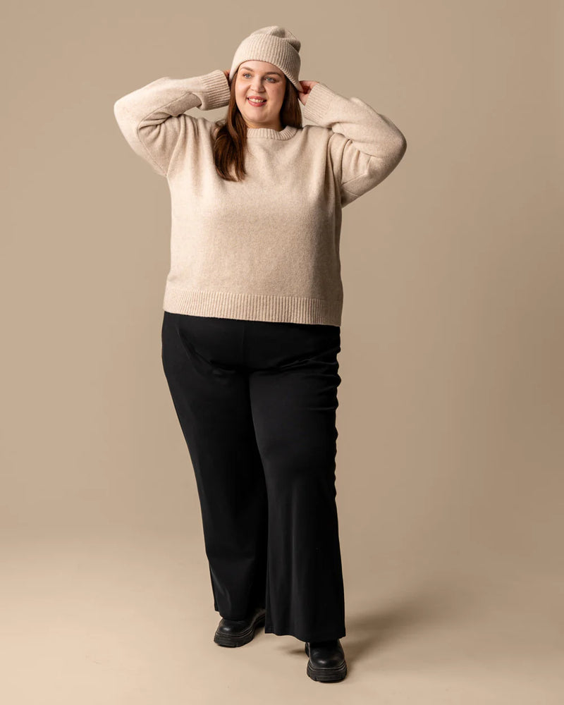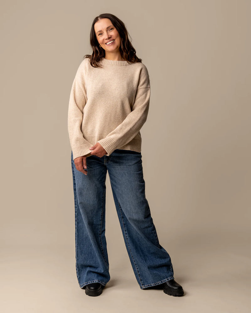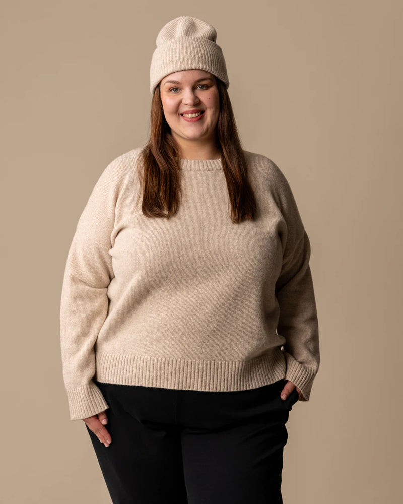 Täydellinen neule kapselivaatekaappiin! Hile neuleessa on pyöreä pääntie ja resorit hihansuissa ja vyötäröllä. Neuleen mitoitus on rento, mutta istuvampi kuin esimerkiksi Utu pooloneuleesa. Sävynä pehmeä ja lämmin beige.