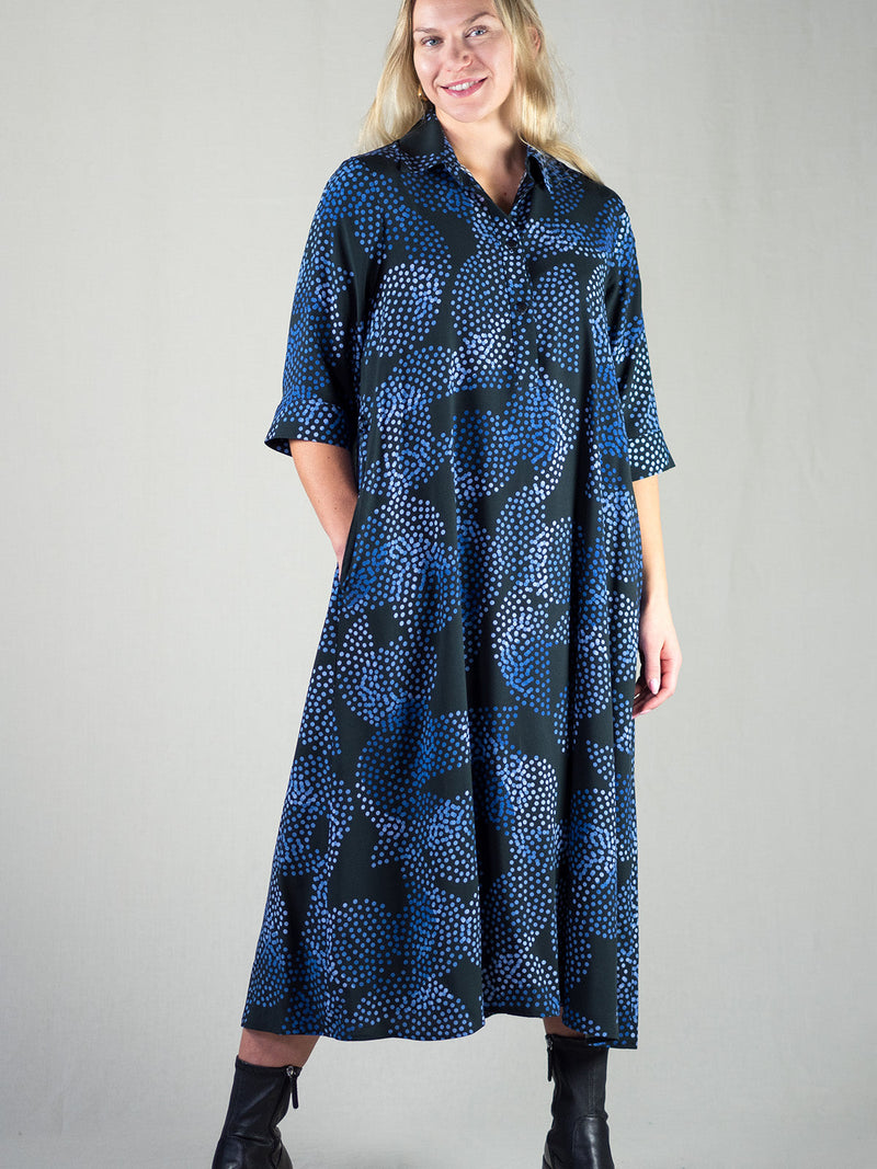 Monikäyttöinen Isadora-paitamekko on valmistettu kauniisti laskeutuvasta 100% viskoosista, jonka Pistepirkko-painokuosissa erisävyiset siniset pisteet muodostavat kuvioita mustalle pohjalle. CUOSIn suosittu mekkomalli Isadora on monille vartaloille sopiva mekko, jossa on kauniisti kellottuva leveä helma ja mukavan väljä paitamainen mitoitus. Isadoraa sopii niin juhlamekoksi kuin asialliseksi arjen luottomekoksi. Mekon ilmettä voi muunnella omaan makuun ja vartaloon sopivaksi mukana tulevalla solmittavalla vyöllä. Vyöllisenä Isadorasta saa kauniin naisellisen kellohelmamekon ja sellaisenaan ilman vyötä mekon A-linjainen siluetti ja hulmuavat helmat korostuvat. Voit myös solmia vyön taakse ja kaventaa siten kevyesti vyötärölinjaa omien mittojen ja mieltymyksen mukaisesti. Isadorassa on puolipitkät suorat hihat, hihanistutus ja olkalinja ovat normaalit. Hartiakaarroke sekä väljyyslaskokset antavat mukavasti liikkumatilaa selän puolelle. Mekossa on normaali paitakaulus ja ylävyötärön korkeudelle päättyvä napituslista. Sivusaumoissa on tietenkin taskut.