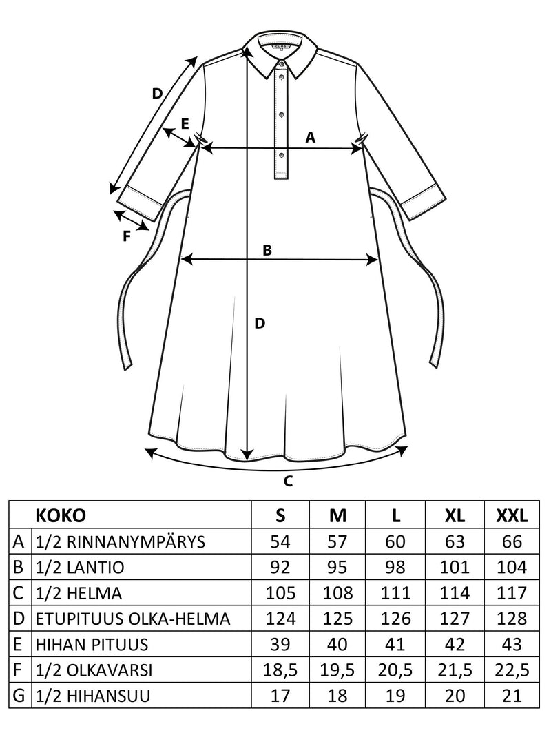 Mitat: Mittataulukkokuvasta voit tarkistaa eri kokojen mitat. Mallilla on päällä koko S, mallin pituus 174 cm.