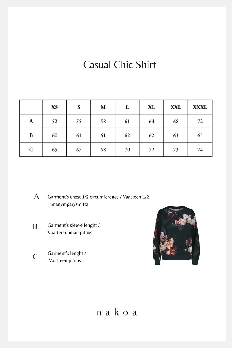 Casual Chic Shirt on vaatekaapin luottotuote, joka on helppo valinta jokaiseen päivään. Casual Chic Shirt istuu kauniisti niin farkkujen kuin hameiden parina. Pukemalla alle kauluspaidan, saat kauniin toimistolookin. Asusteilla ja koruilla on helppo luoda vaihtelua haluamaasi tyyliin. Kangas on kauniisti laskeutuvaa, ohutta luomupuuvillasta valmistettua collegea. Kangas tuntuu miellyttävältä yllä.