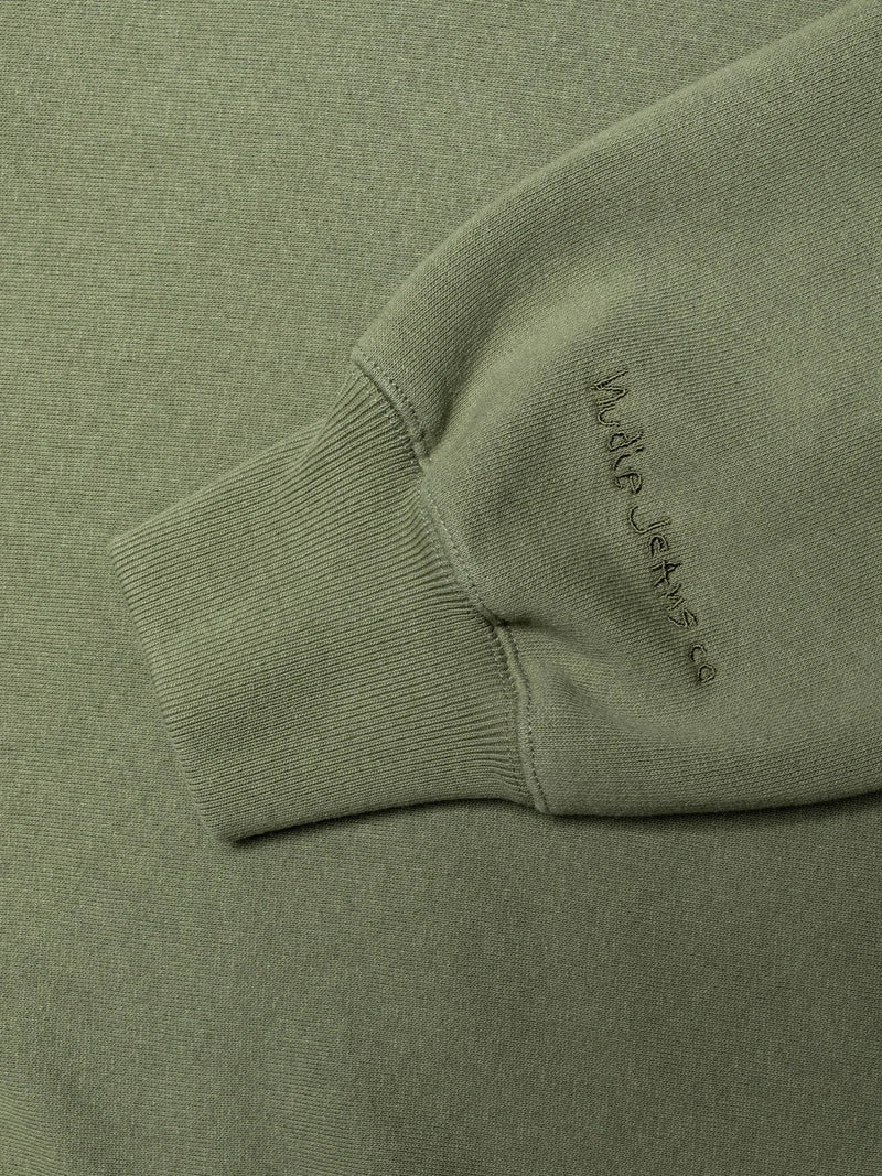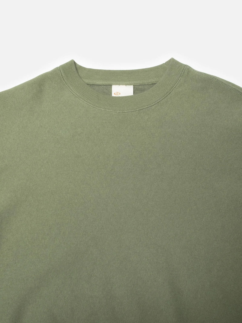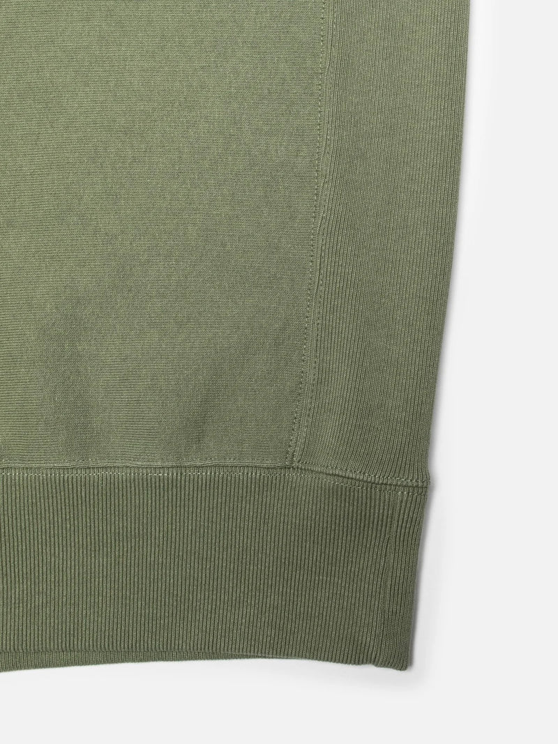This crew-neck sweatshirt is made in a heavy jersey with a soft brushed interior. It's a blend of organic cotton and recycled polyester. Unlike traditional garments cut along the length grain, this sweatshirt is cut on the cross grain, giving it a sturdier feel. The beautiful faded pale green shade and lightly worn look are achieved through a garment dye process followed by a fade-out wash.