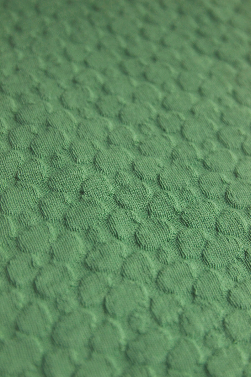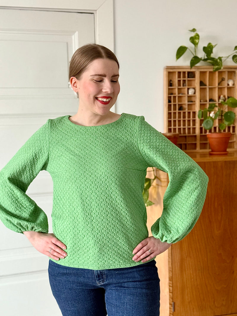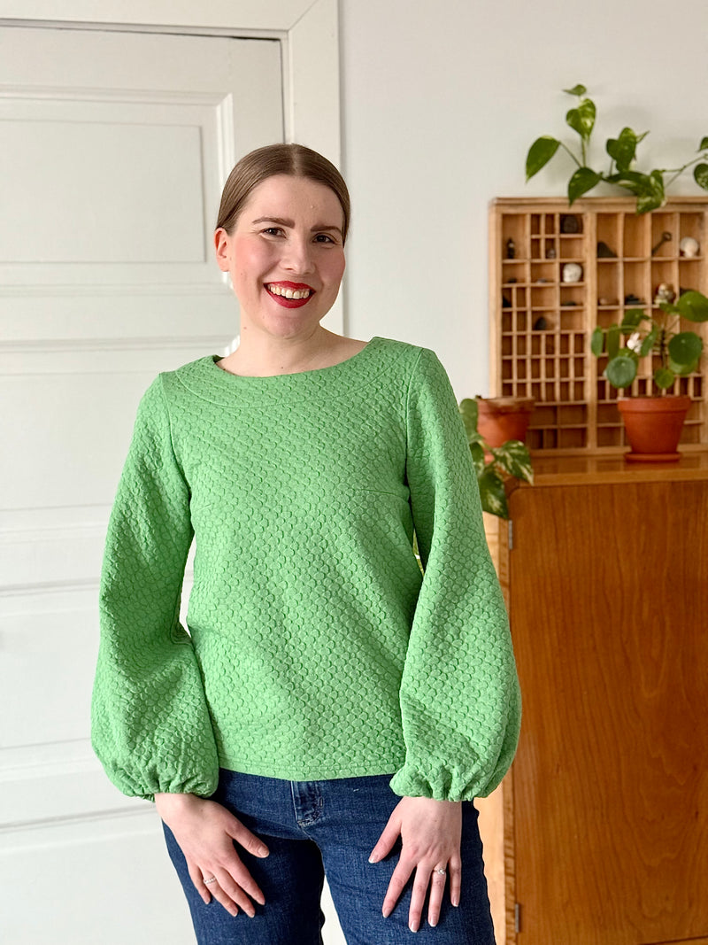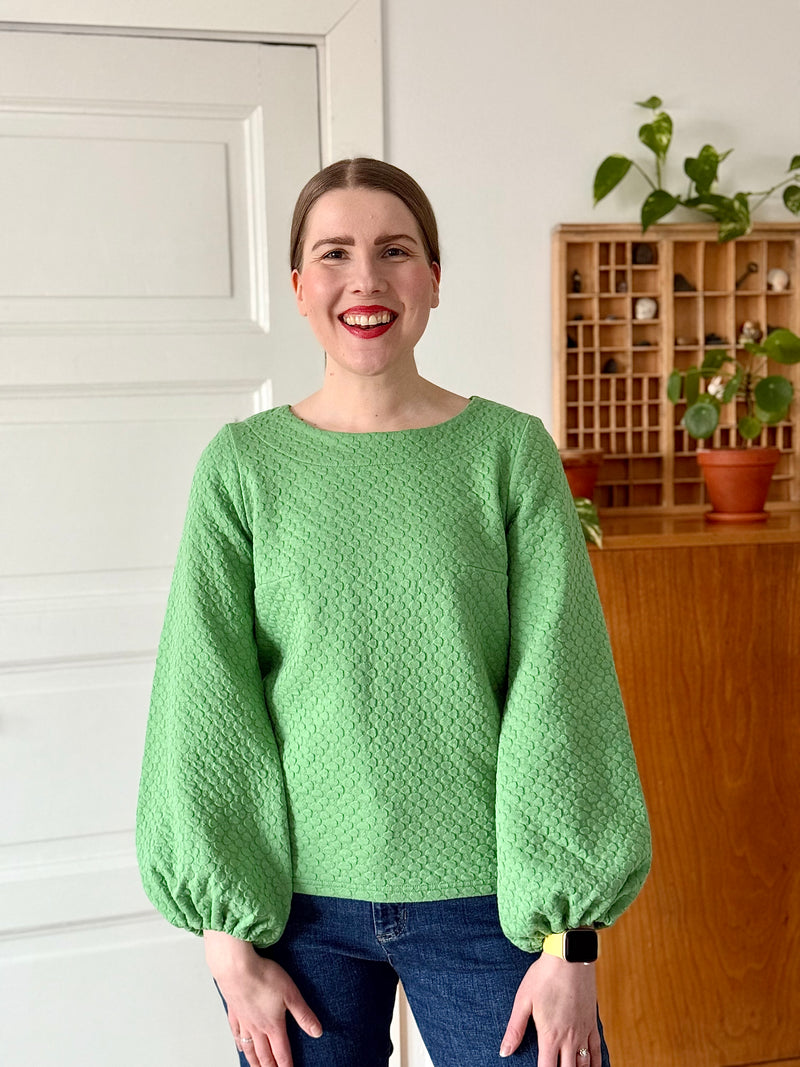 Materiaalina helppohoitoinen 100% luomupuuvillaneulos, jossa kaunis pistaasin värinen Apila-struktuurikuosi.