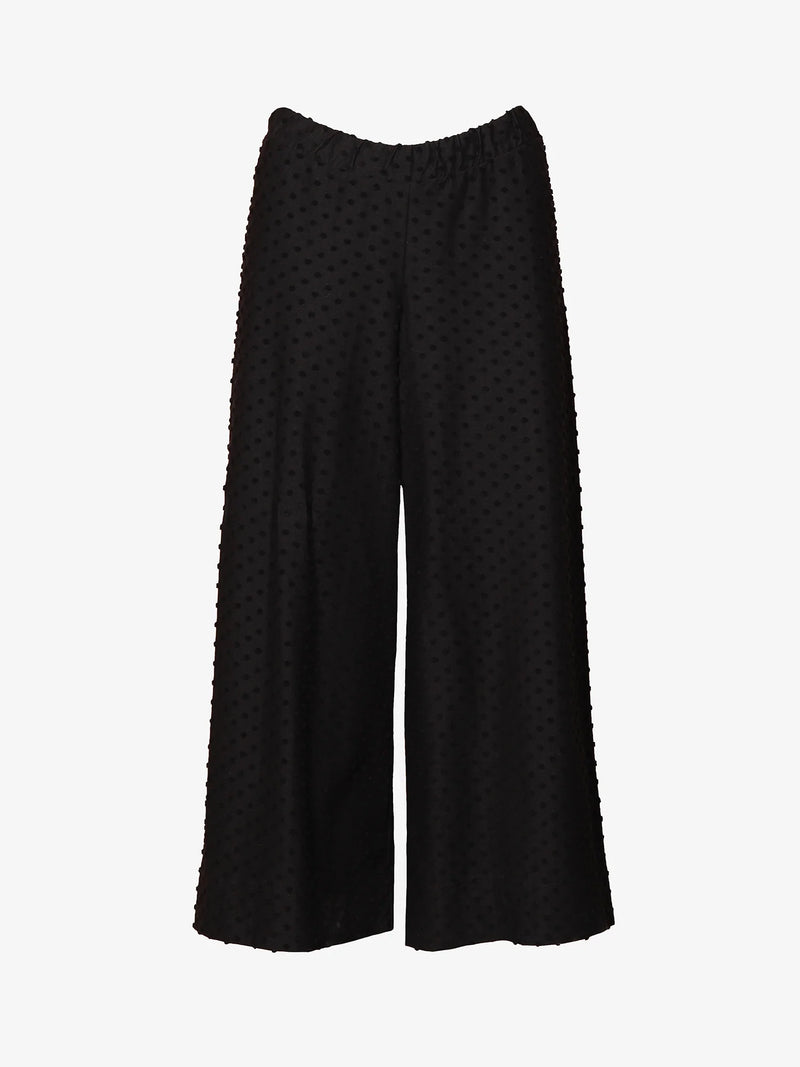 Culottes-housut upeasta Dot struktuurimateriaalista! Dot on trikoon paksuinen neulos, jossa on froteemaisia pieniä pilkkuja, jotka kohoavat neuloksen pinnasta tehden siitä ihanan eläväisen. Dot materiaali ei sisällä elastaania, mutta kangas joustaa silti jonkin verran. Vyötäröllä leveä kuminauha.