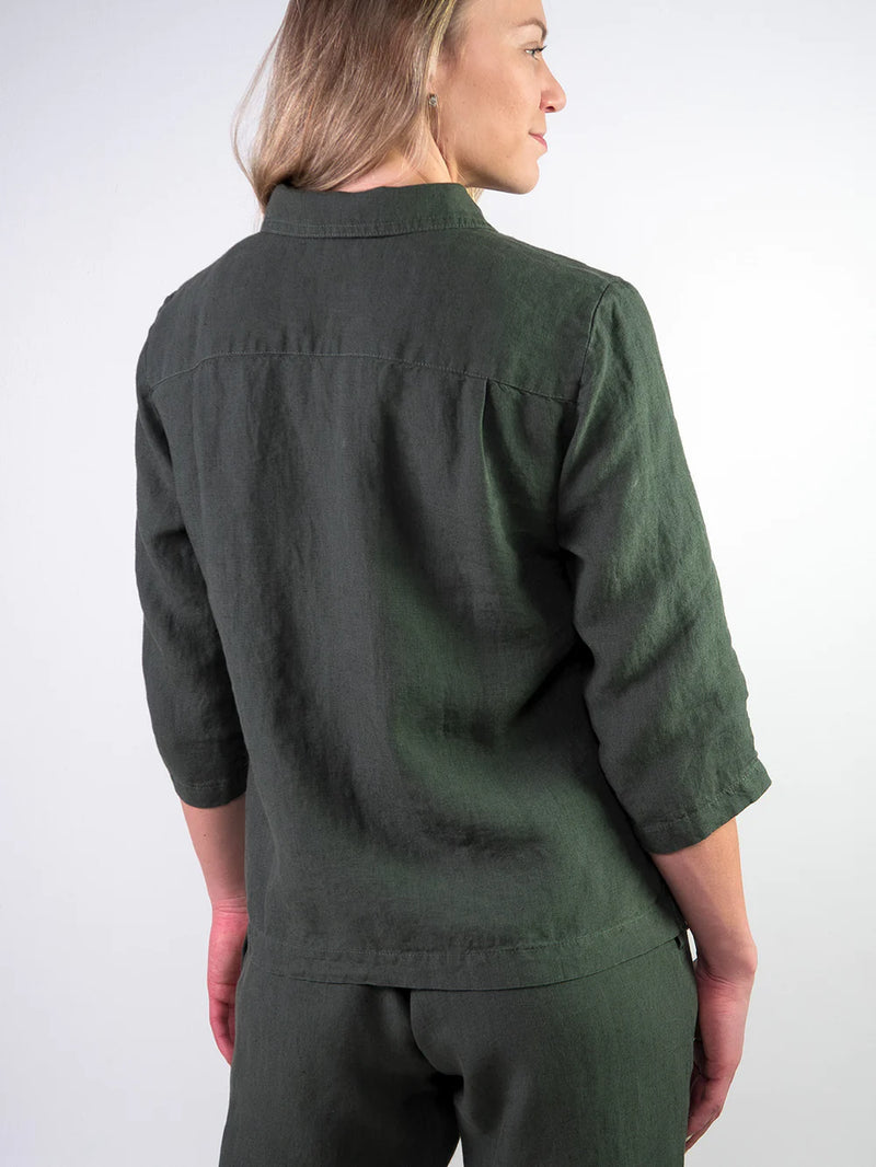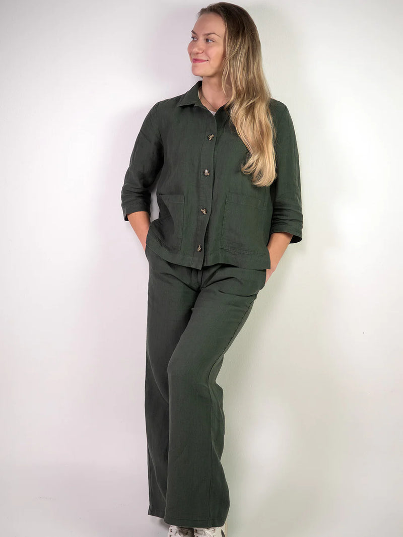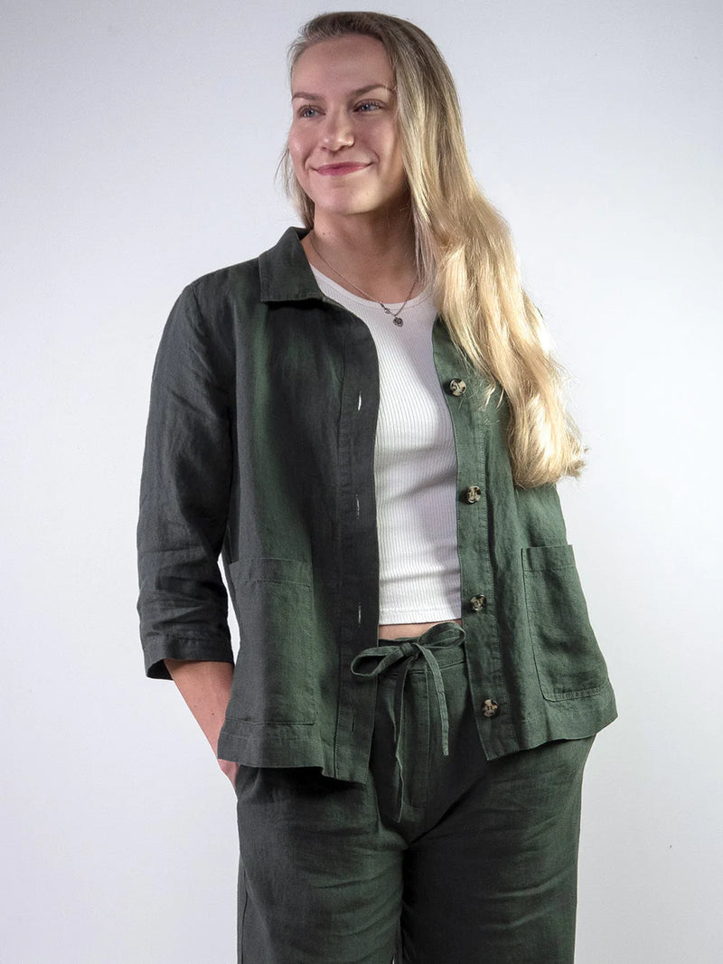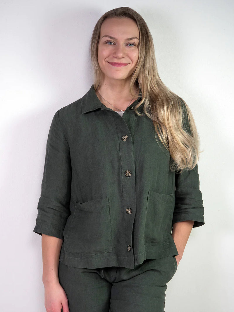 Elsa on lyhyt vuoriton worker-tyylinen paitajakku, jossa edessä on reilunkokoiset paikkataskut. Elsa sopii kevyeksi kesäiseksi heittojakuksi, kun tarvitset jotain peittävämpää päällesi viileän sään varalta. Voit käyttää sitä myös paidan tapaan kiinni napitettuna. Se on kätevä ja siisti jakku matkalle mukaan. Tyylikkään yhtenäisen asukokonaisuuden saat yhdistämällä jakun Asta-pellavahousujen kanssa. Malli on suoralinjainen ja mitoitukseltaan väljä. Hartiakaarrokke ja väljyyslaskokset antavat liikkumatilaa selkäpuolelle. Hihat ovat suorat ja puolipitkät, edessä nappikiinnitys ja sivuissa helmassa pienet halkiot. Elsa on valmistettu laadukkaasta kauniisti laskeutuvasta ja miellyttävän tuntuisesta Öko-Tex sertifioidusta 100% pellavasta. Kangas on esikutistettu ja lisäksi jakku on tuotepesty, joten se ei kutistu enää kotipesuissa. Jakku on ommeltu lähituotantona Virossa pienessä ompelimossa, pellavan alkuperämaa on Liettua.