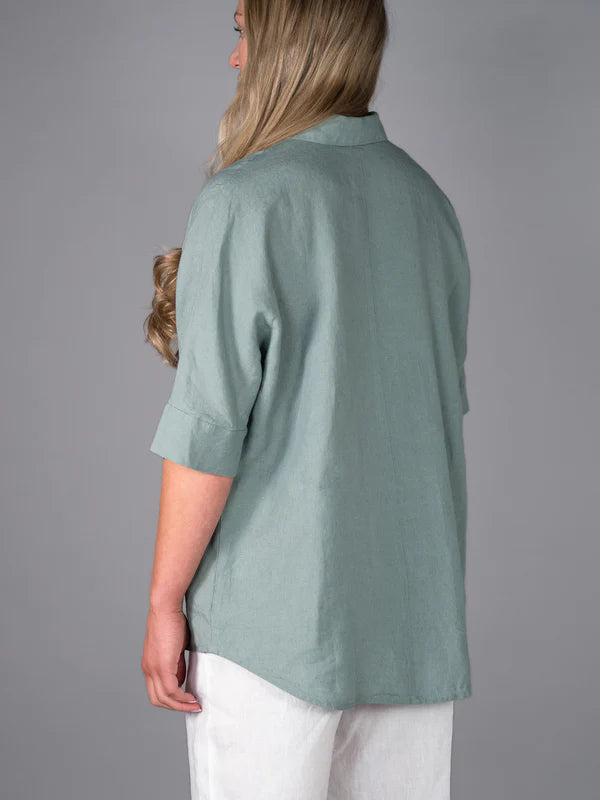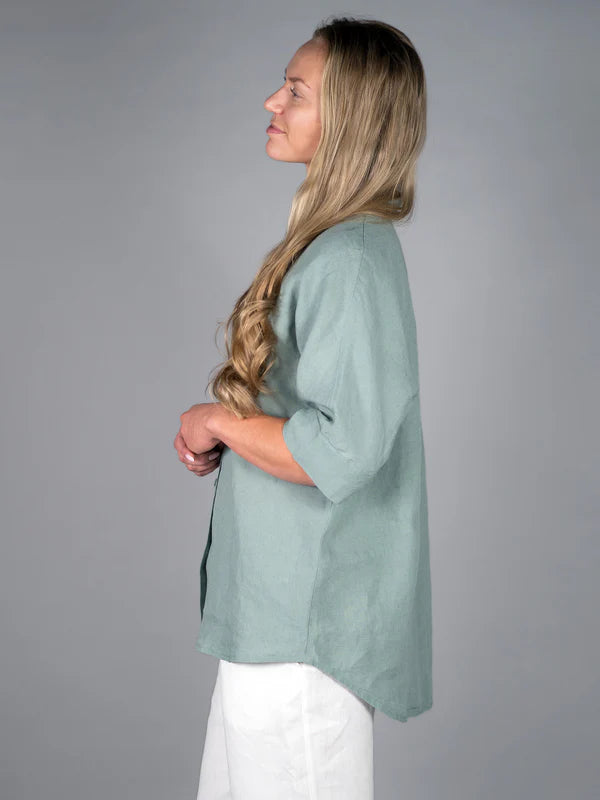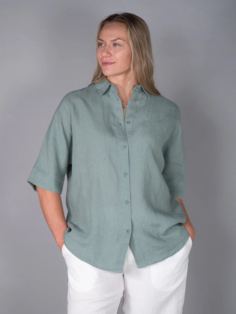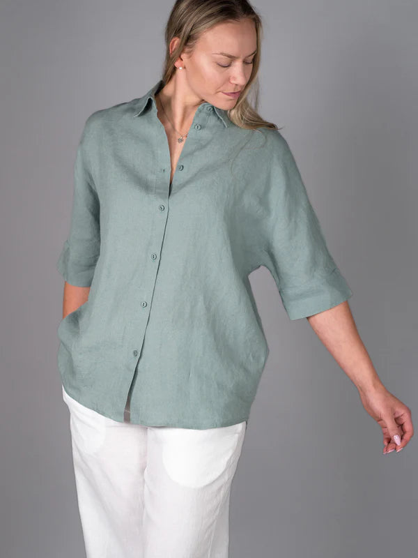 Ajattoman tyylikäs Irja on monikäyttöinen ja rento pellavapaita, jossa on oversize mitoitus. Irja sopii myös mainiosti kesäiseksi heittojakuksi topin tai vaikkapa mekon päälle. Paita on suoralinjainen ja mitoitukseltaan hyvin väljä, hihat ovat puolipitkät ja jatkuvat yhtenäisesti miehustasta holkkihihan tavoin. Helman muoto on pyöristetty ja takaa hieman pidempi kuin edestä. Kaulus on normaali paitakaulus, edessä nappikiinnitys. Irja on valmistettu laadukkaasta ja kauniisti laskeutuvasta Öko-Tex sertifioidusta 100% pellavasta, joka tuntuu miellyttävältä ihoa vasten. Kangas on esikutistettu ja lisäksi paita on tuotepesty, joten se ei kutistu enää seuraavilla pesukerroilla. Paita on ommeltu liettualaisessa ompelimossa, pellavan alkuperämaa on myös Liettua.