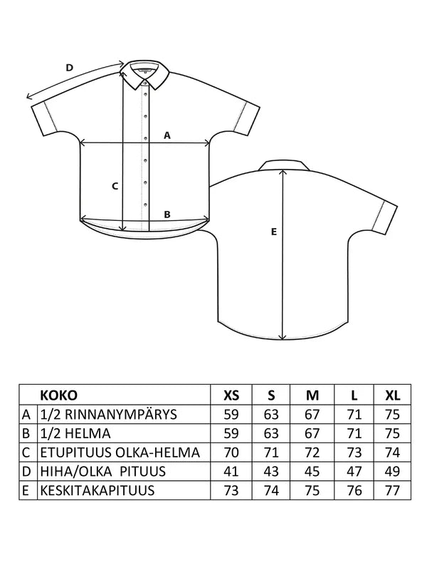 Hoito-ohjeet: Pese paita 40 asteen pesuohjelmassa saman väristen kanssa. Käytä kevyttä linkousta ja kuivata paita henkarille ripustettuna. Silitys kahden pisteen (150 C) lämpötilalla kosteana, mielellään nurjalta puolelta.