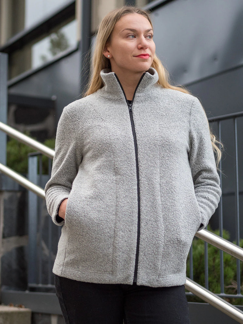 Jemina on kevyt ja lämmin villafleeceneuloksesta valmistettu takki. Se sopii mainiosti leudon talven ja välikauden ulkoiluun ja pihapuuhasteluun tai viileisiin sisätiloihin. Fleece-neuloksessa on 63% villaa, mikä tekee takista erityisen lämpimän ja sopivan myös pakkaskelien kerrospukeutumiseen. Jemina on suoralinjainen lantiomittainen malli, jossa on normaali olkalinja ja hihanistutus. Mallissa on pystykaulus ja edessä vetoketjukiinnitys. Etusivusaumoihin on upotettu tilava lepotasku. Takki on vuoriton. Fleecetakin pituus edessä olalta helmaan koossa M on 74 cm. Mallin päällä kuvissa koko M, mallin pituus 174 cm