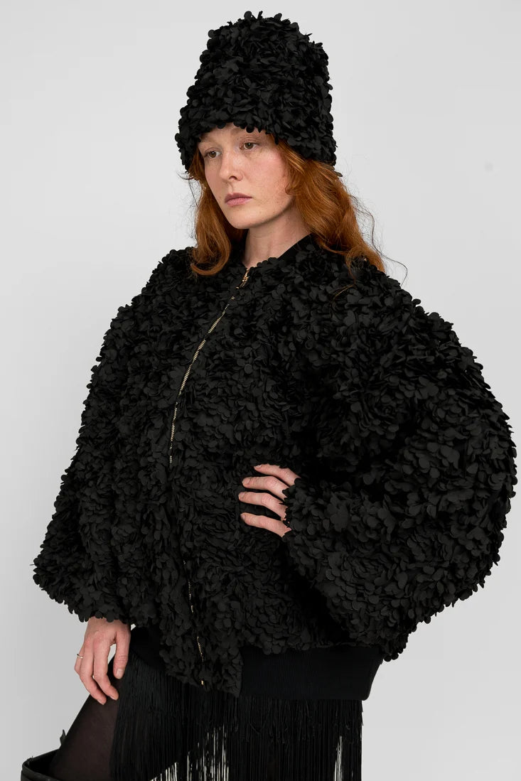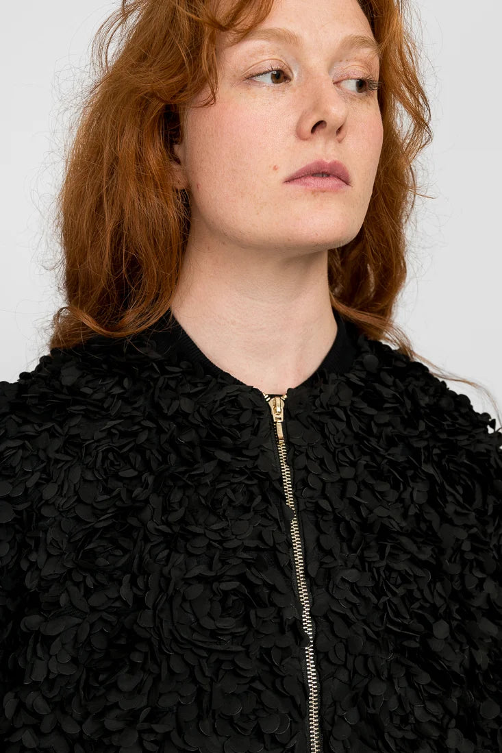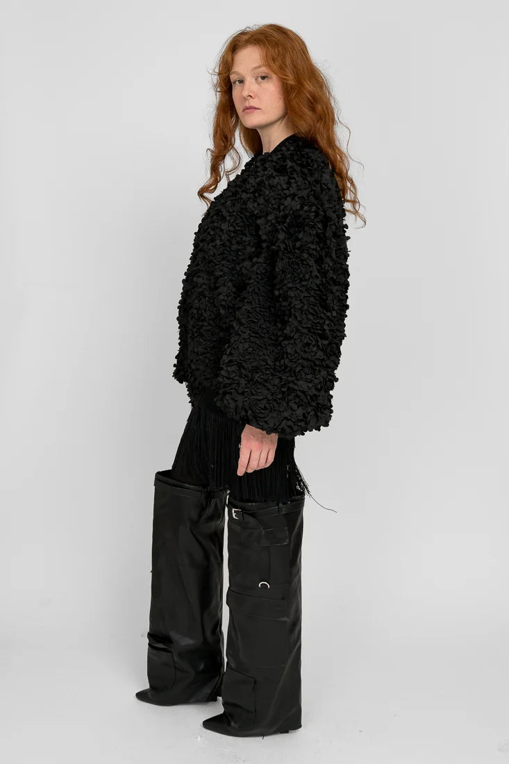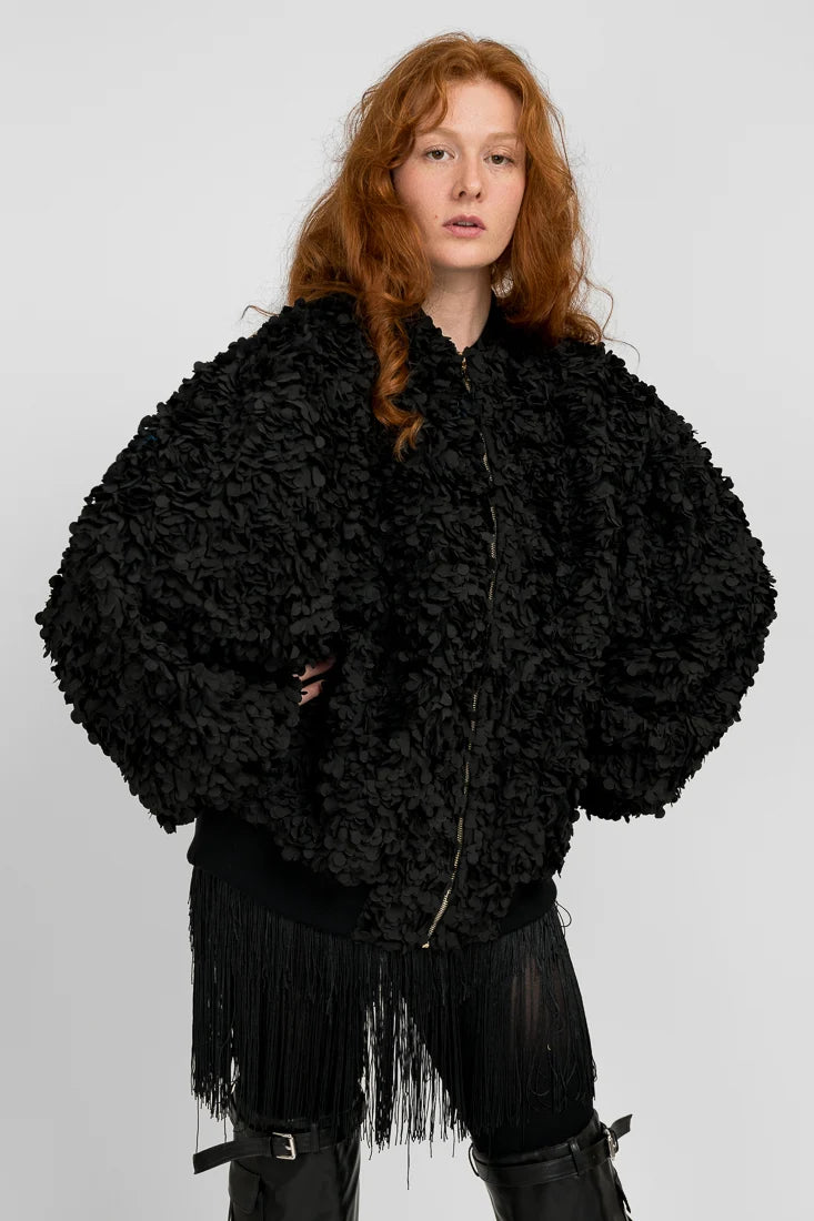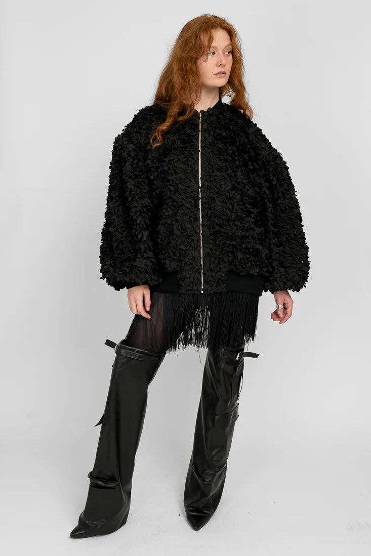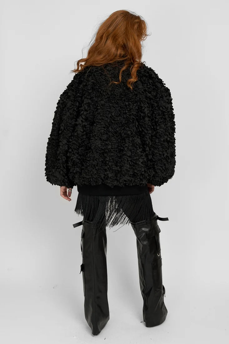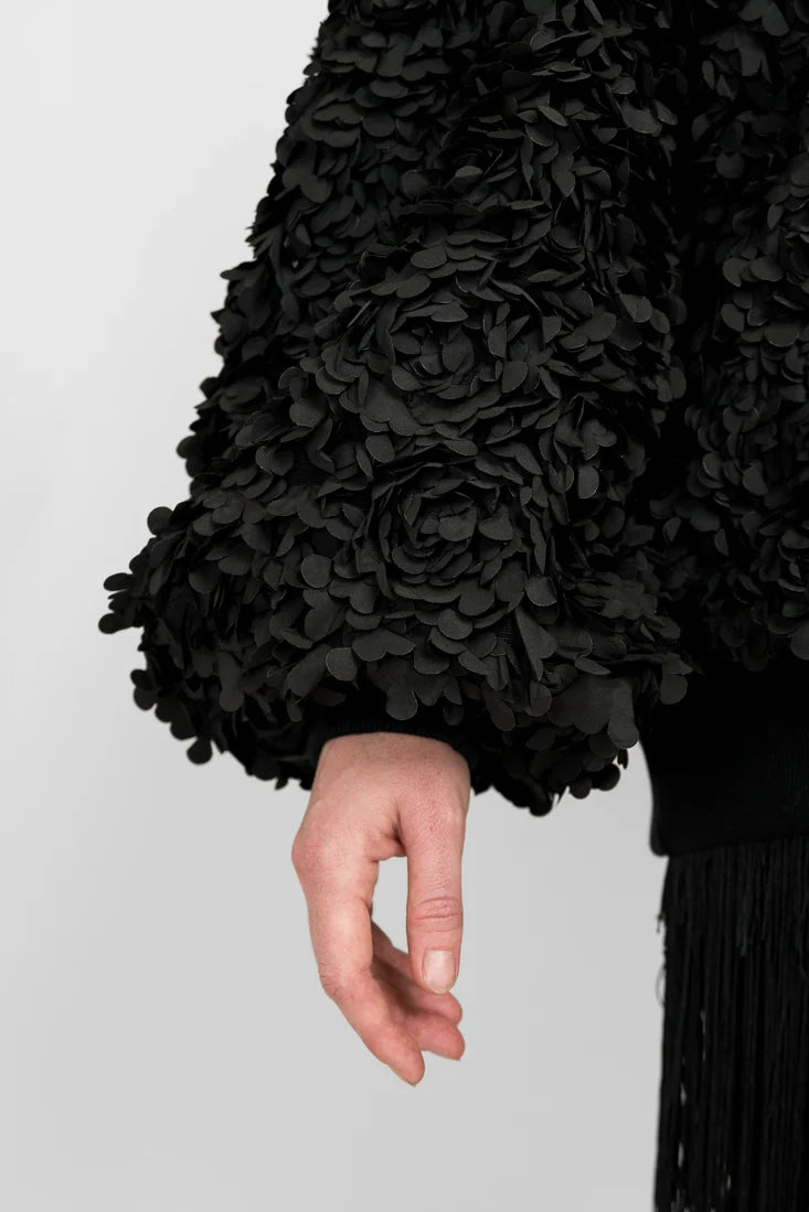 Materiaalina tässä mekossa on hieman läpikuultava, ylellinen hapsukangas, joka laskeutuu ja liikkuu kauniisti. Mustien hapsujen joukossa on kimaltelevia hapsuja.