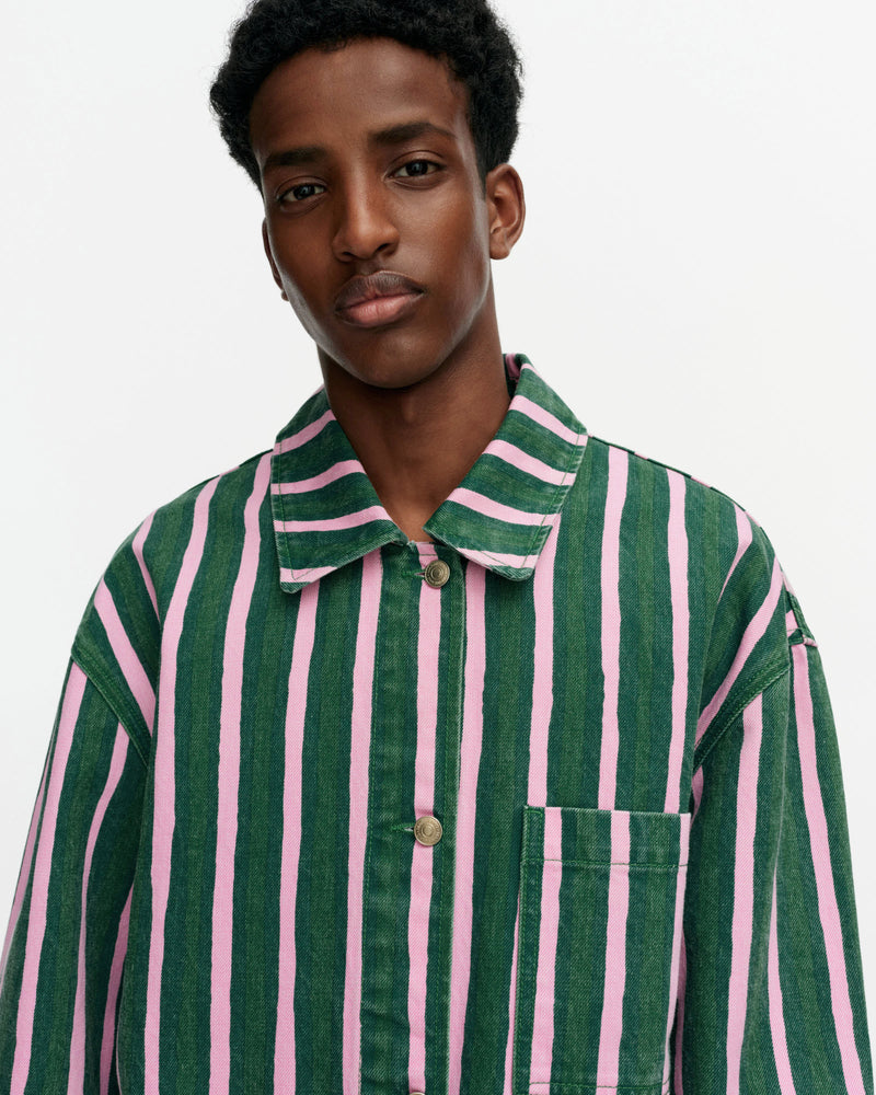 Piccolo-kuosinen Poweri-farkkutakki on valmistettu puuvillakankaasta, joka ei sisällä elastaania. Takissa on väljä istuvuus, paitakaulukset, nappisuljenta ja yksi rintatasku. Takissa on läpälliset paikkataskut edessä ja Marimekko-farkkunapit.