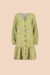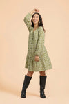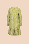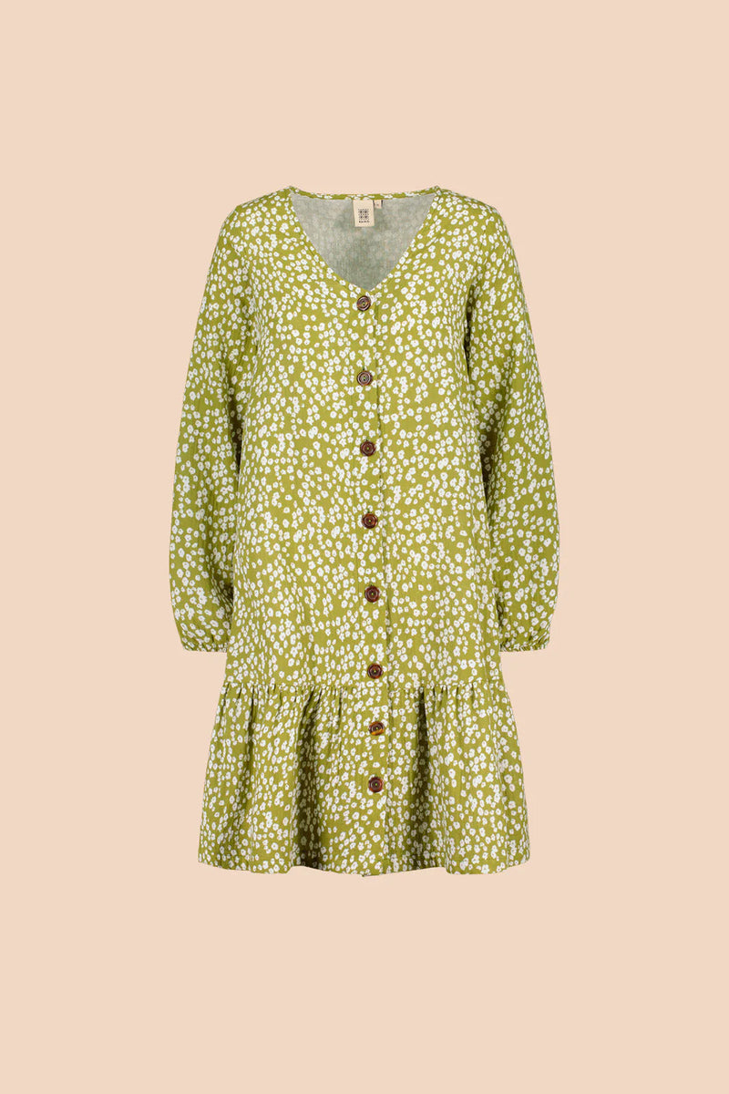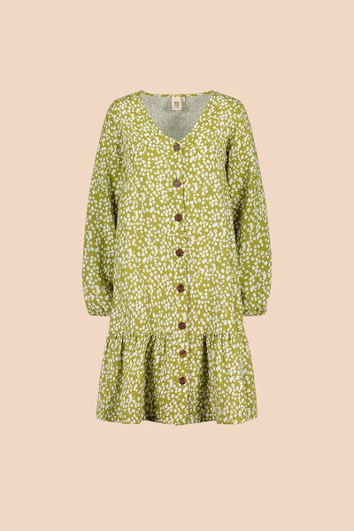 Vastuullisesti valmistetussa mekossa on väljä istuvuus, V-pääntie ja rennot täyspitkät hihat. Hihansuut on poimutettu kuminauhalla, jonka ansiosta mekon hihat on helppo vetäistä halutessaan kyynärmittaan. Mekon keskietua koristaa avattava nappirivi, ja helmaa somistaa poimutettu frilla. Frillan korkeus on 25 cm, ja helman pituus on noin polvimittainen. Kuosina on ajaton Flora Olive, jossa pienet valkoiset kukat rönsyilevät oliivinvihreällä pohjalla.