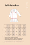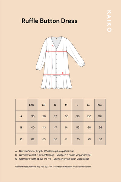 Ruffle Button Dress on istuvuudeltaan väljä (tuotteen mitat löydät viimeisestä kuvasta). Neuvomme valitsemaan koon pienemmän, jonka normaalisti valitsisit. Mikäli olet rintava, valitse normaalisti käyttämäsi koko. Rinnanympärys on melko istuva, kun taas vyötärö on väljä. Helman pituus on noin polvimittainen. Käytä koon valinnan apuna vartalonmittataulukkoa sekä tuotteen mittoja (viimeinen kuva).
