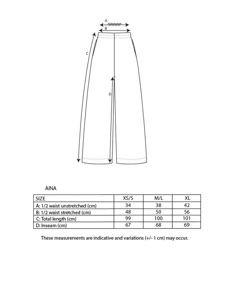 Aina-housut vastaavat hyvin kokoaan ja suosittelemme valitsemaan koon, jota normaalistikin käyttäisit alaosissa. Joustavan kuminauhavyötärön ansiosta housut istuvat hyvin ja ovat mukavat päällä.