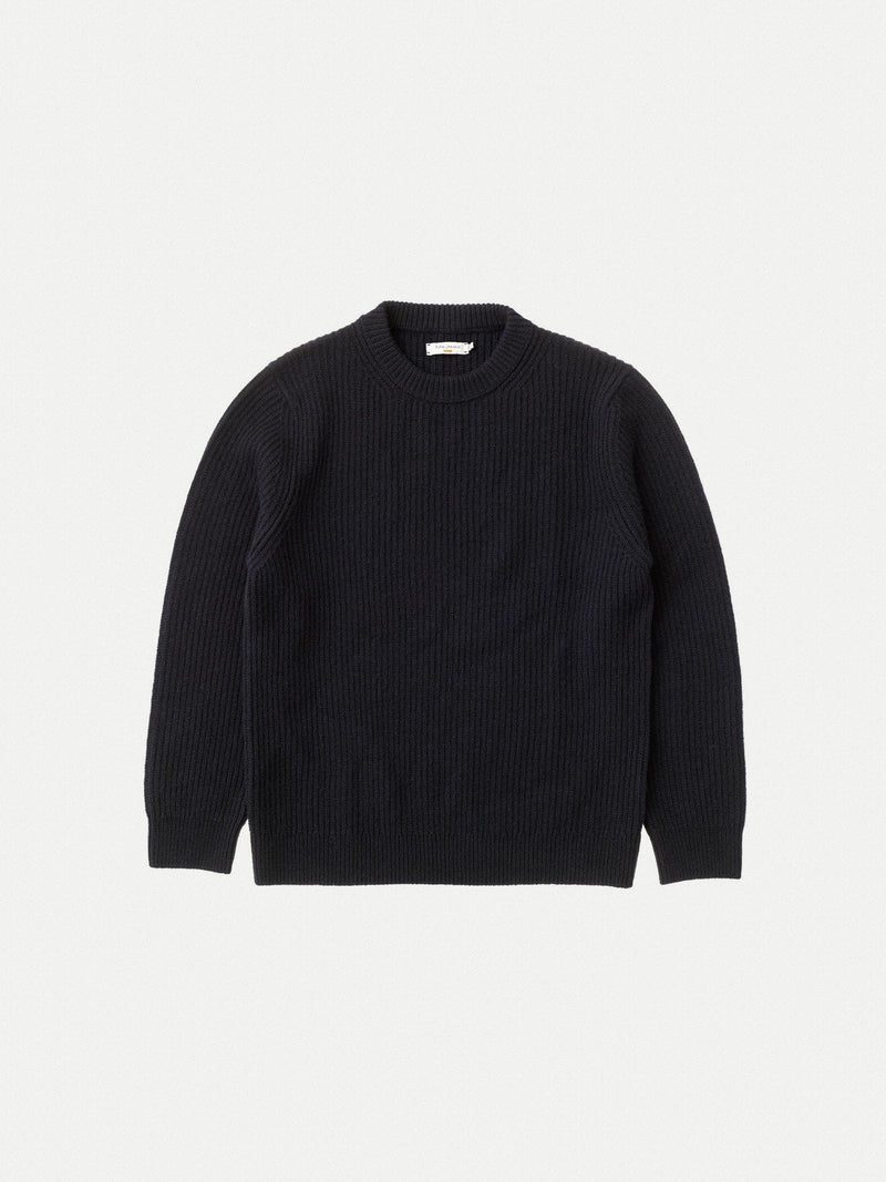 Crew neck sweater made with 100% organic wool. The knitting technique is called full cardigan stitch. It looks like a rib but gives a fuller knit with more distinct wales. The knit offers a combination of warmth and lightness that is characteristic of wool garments. Overall, August is a real catch!