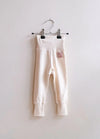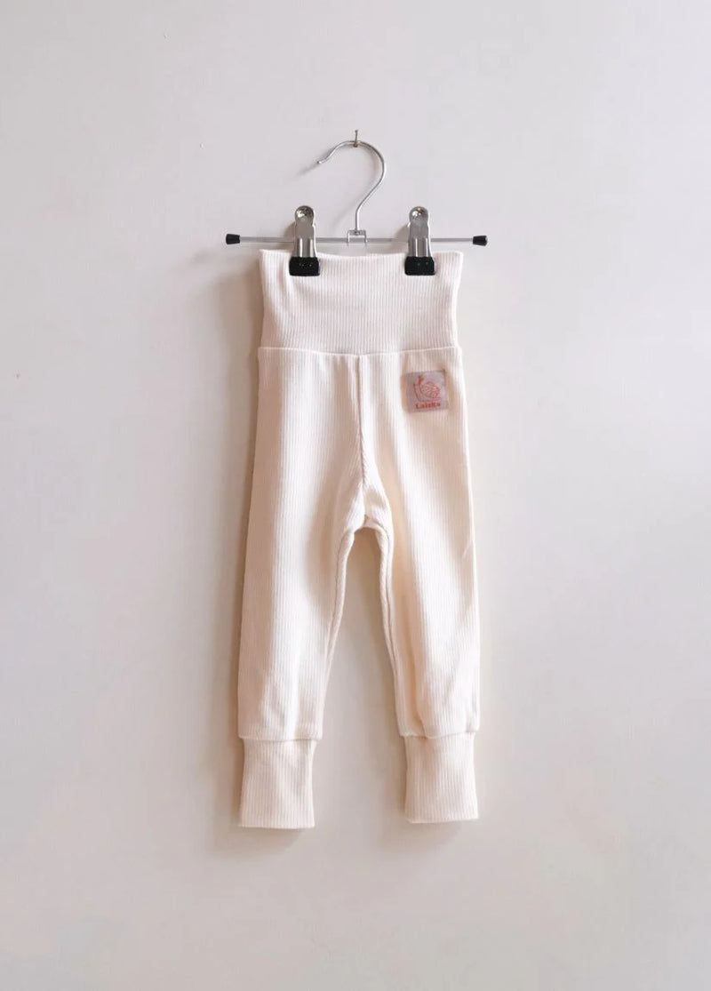 Leggings made from undyed, natural, GOTS-certified cotton. Soft, foldable waist and cuffs perfect for sprouting lil' baby legs.
