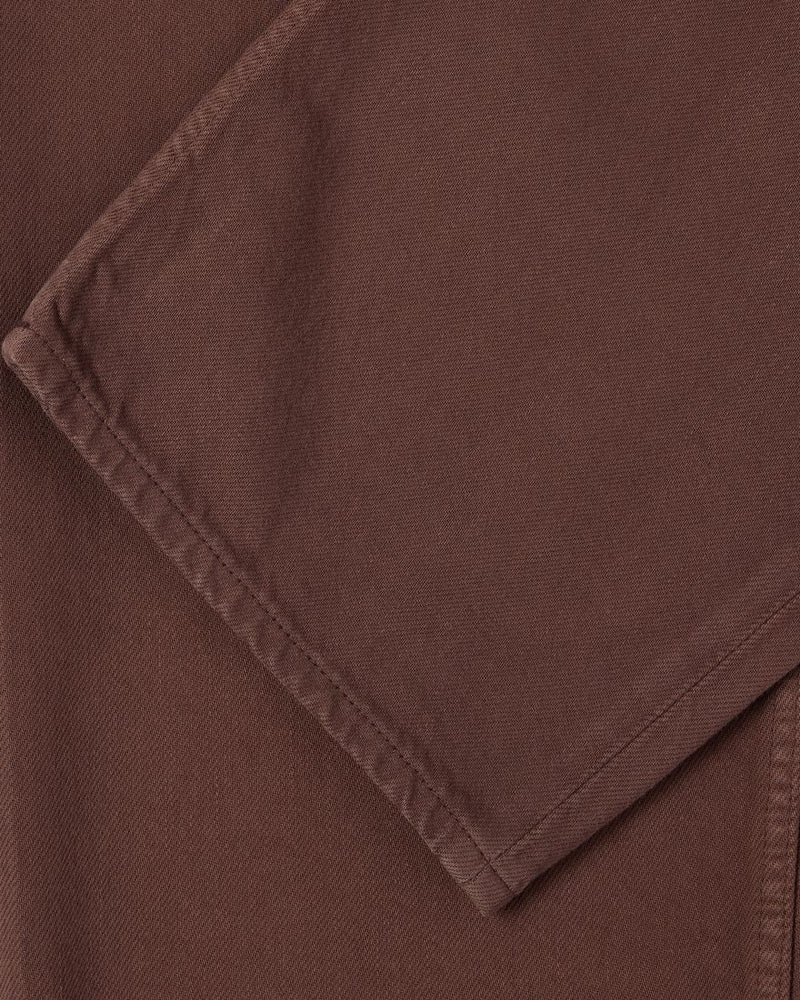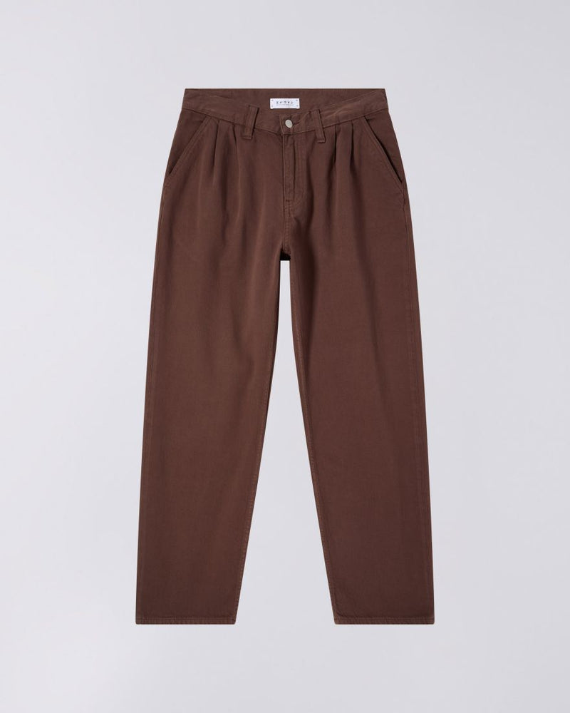 The EDWIN Bamba Pant features a loose fit with a high rise and roomy top block for comfortable wear. Made from 10.75oz Mopac PFD Denim (100% organic cotton), it has a slight taper from the knees down, giving it a modern shape. The pant includes four pockets, double pleats at the front, tonal stitching, and a zip fly for classic style and functionality.