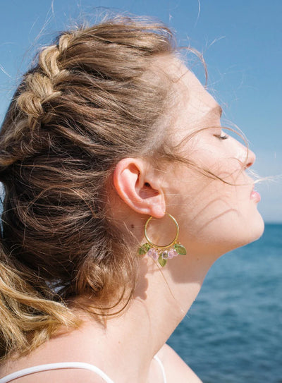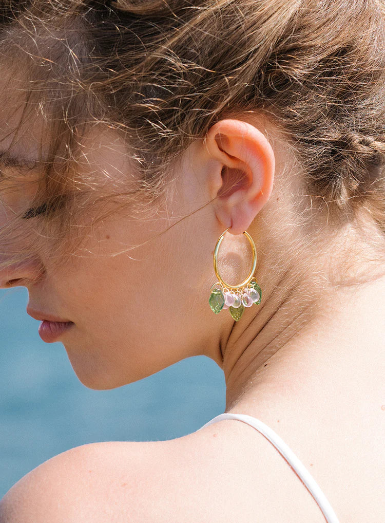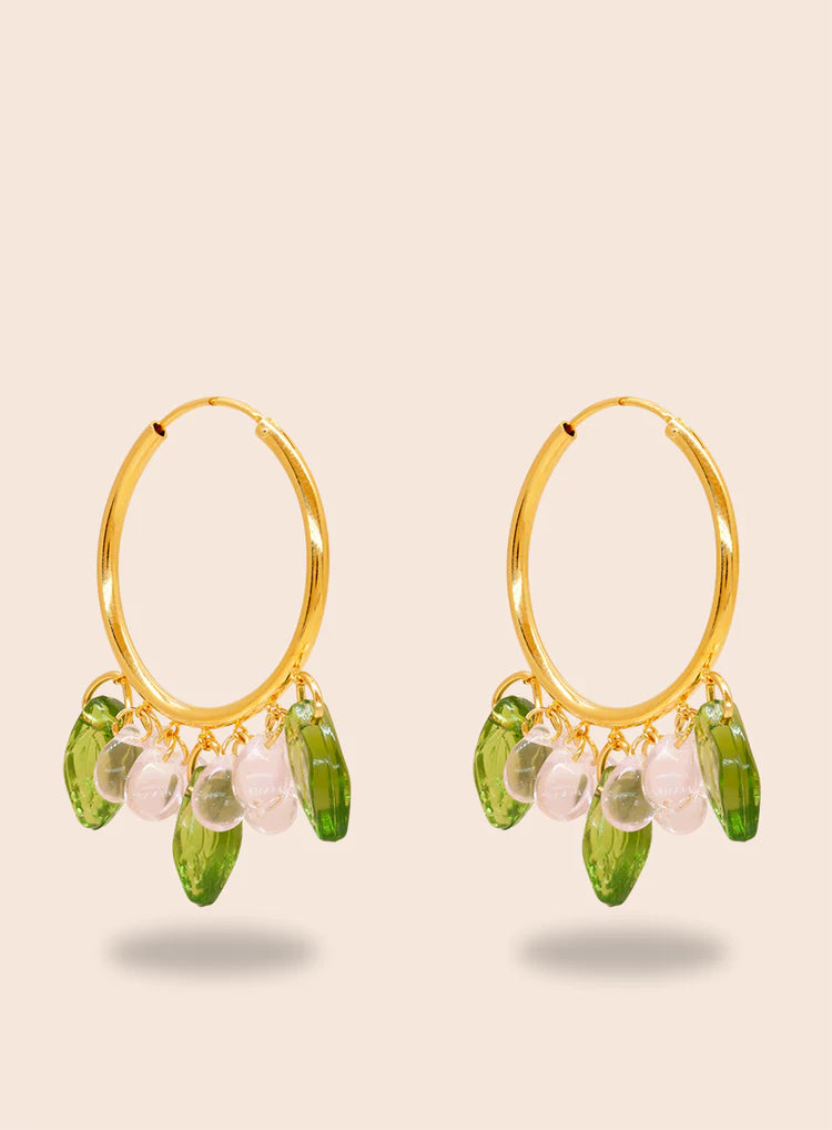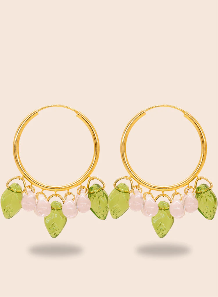Serving up some sweet happiness. Berrymisu -korvakoruissa on 18k kullalla päällystetyt 925 sterling-hopearenkaat, lasihelmiä ja akryylilehdet.