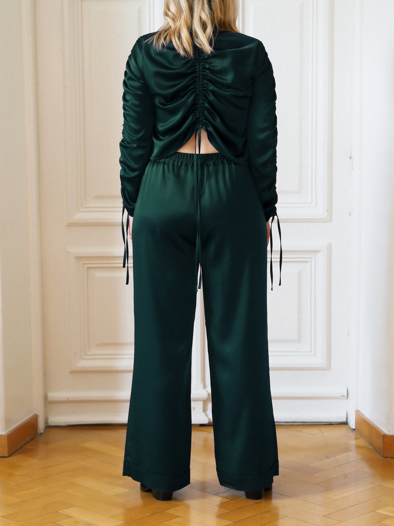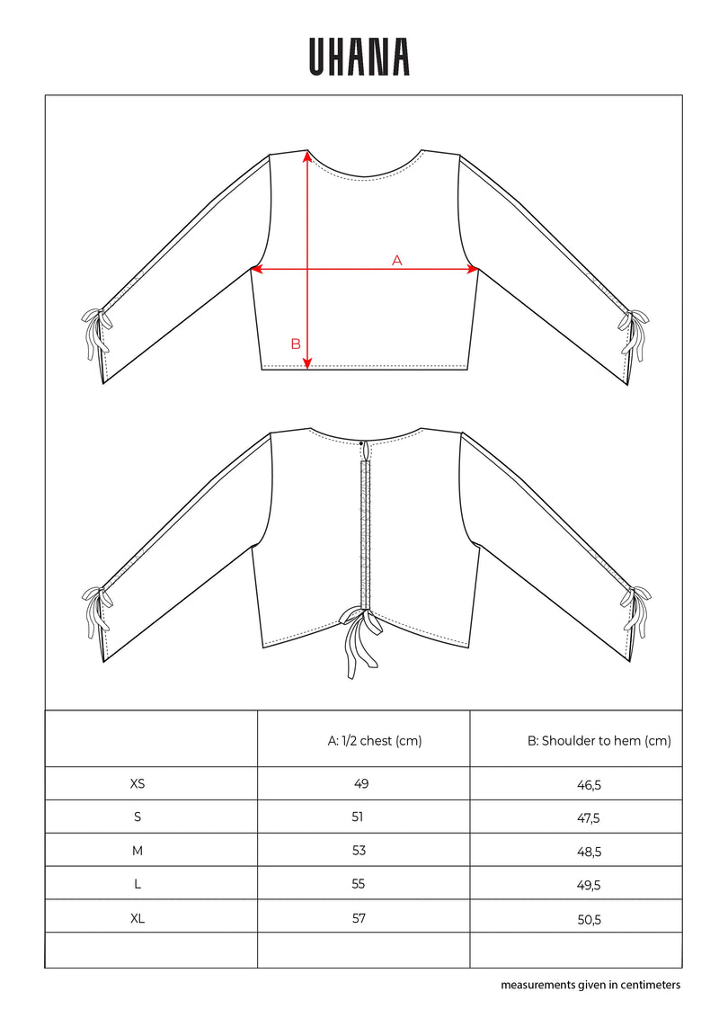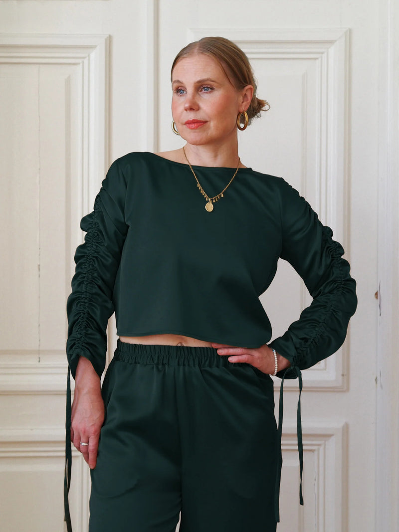 Istuva pusero, jossa lyhennetty helma ja pyöreä pääntie. Puseron upeat rypytysyksityiskohdat hihoissa ja selässä tekevät siitä kiehtovan katseenvangitsijan. Laadukas japanilainen triasetaatti tuntuu pehmeältä ihoa vasten ja laskeutuu kauniisti. Materiaali on upean tuntunsa ja hohtonsa lisäksi helppohoitoinen, eikä rypisty helposti. Monikäyttöinen malli on helppo yhdistää erilaisiin alaosiin luoden aina uuden ilmeen.