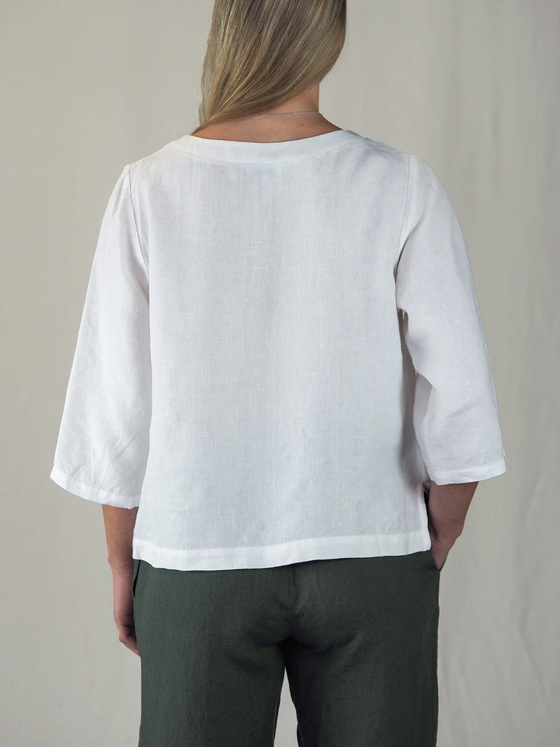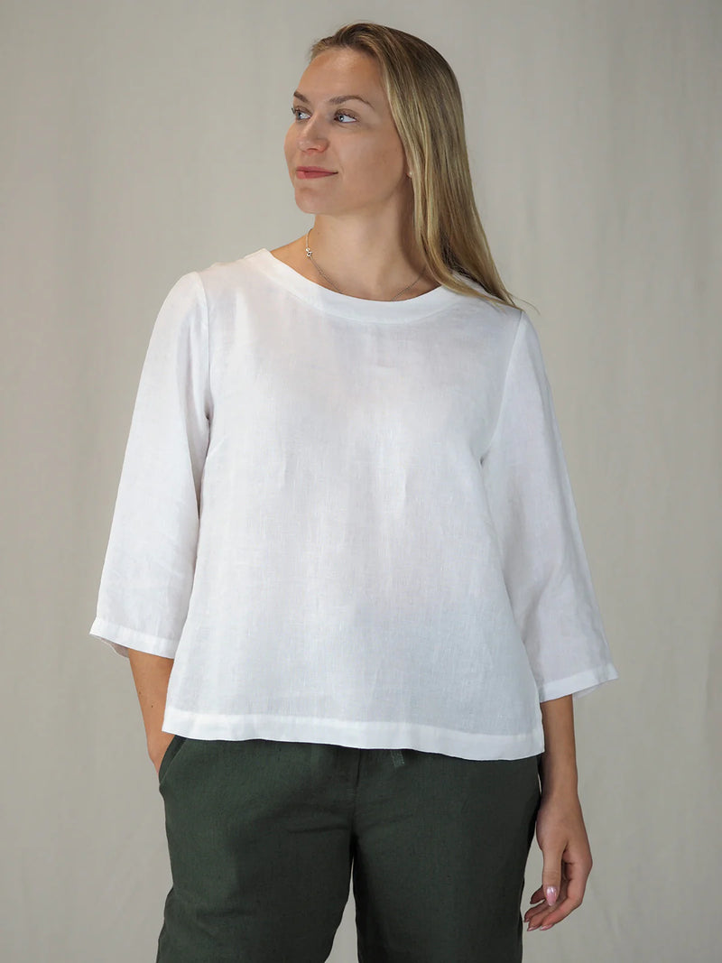 Ajaton Ilona-pellavapusero on monikäyttöinen ja helppo vaate yhdistettäväksi erilaisiin asukokonaisuuksiin. Pellavapusero nostaa arkisenkin lookin astetta juhlavammaksi ja tuntuu samalla päällä mukavalta. Yksinkertaisen suoralinjainen ja väljä malli istuu kauniisti monelle erilaiselle vartalolle. Puserossa on puolipitkät hihat ja pyöreä pääntie, helmassa on pienet sivuhalkiot. Ilona on valmistettu laadukkaasta ja kauniisti laskeutuvasta miellyttävän tuntuisesta Öko-Tex sertifioidusta 100% pellavasta. Kangas on esikutistettu ja tuotepesty, joten se ei kutistu enää seuraavilla pesukerroilla. Pusero on suunniteltu Suomessa ja ommeltu Liettuassa. Pellavakankaan alkuperämaa on Liettua.