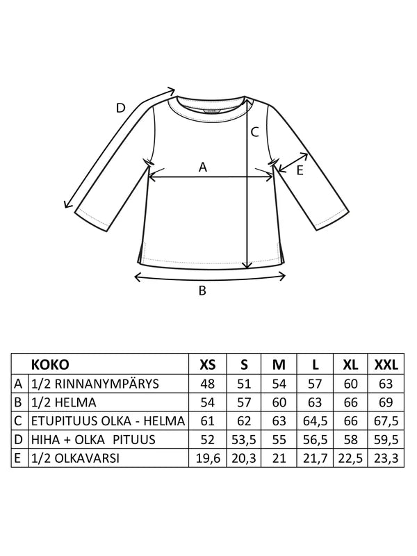 Hoito-ohjeet: Pese pusero 40 asteen pesuohjelmassa saman väristen kanssa. Käytä kevyttä linkousta ja kuivata pusero henkarille ripustettuna. Silitys kahden pisteen (150 C) lämpötilalla hieman kosteana, mielellään nurjalta puolelta.