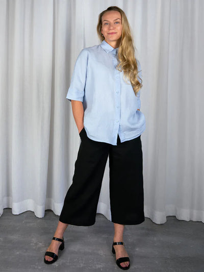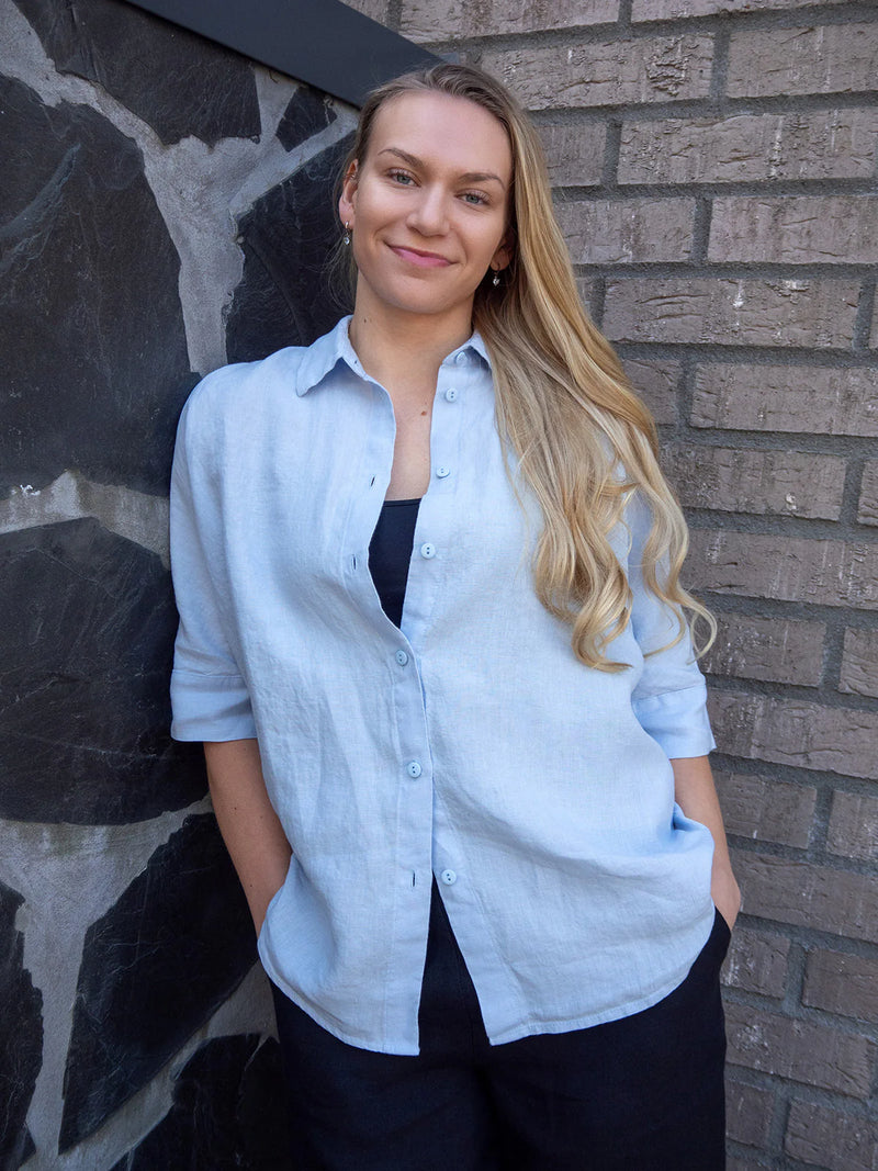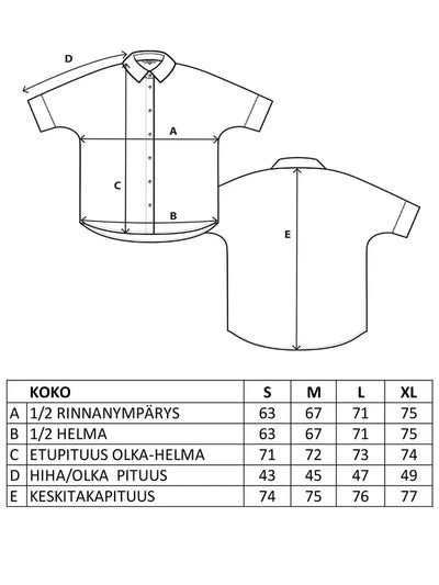 Ajattoman tyylikäs Irja-pellavapaita on monikäyttöinen ja rento paitamalli, jossa on mukavan mahtuva oversize mitoitus. Irja sopii mainiosti myös kesäiseksi heittojakuksi topin tai vaikkapa mekon päälle. Paita on suoralinjainen ja mitoitukseltaan väljä, hihat ovat puolipitkät ja jatkuvat kimonoleikkauksella yhtenäisesti miehustasta. Helman muoto on pyöristetty ja takaa hieman pidempi kuin edestä. Kaulus on normaali paitakaulus, edessä nappikiinnitys. Irja on valmistettu laadukkaasta ja kauniisti laskeutuvasta miellyttävän tuntuisesta Öko-Tex sertifioidusta 100% pellavasta. Kangas on esikutistettu ja lisäksi paita on tuotepesty, joten se ei kutistu enää seuraavilla pesukerroilla. Paita on ommeltu lähituotantona Virossa pienessä ompelimossa, pellavan alkuperämaa on Liettua.