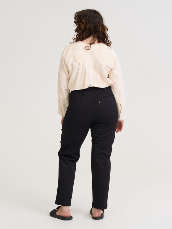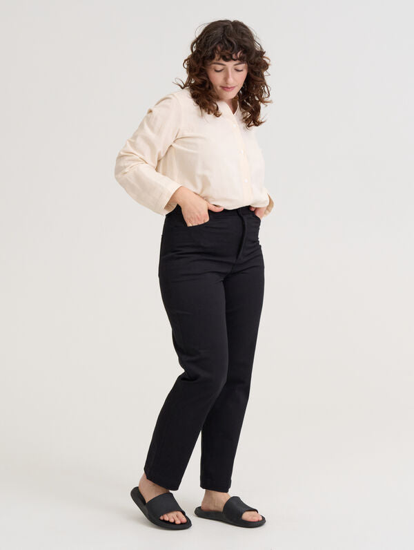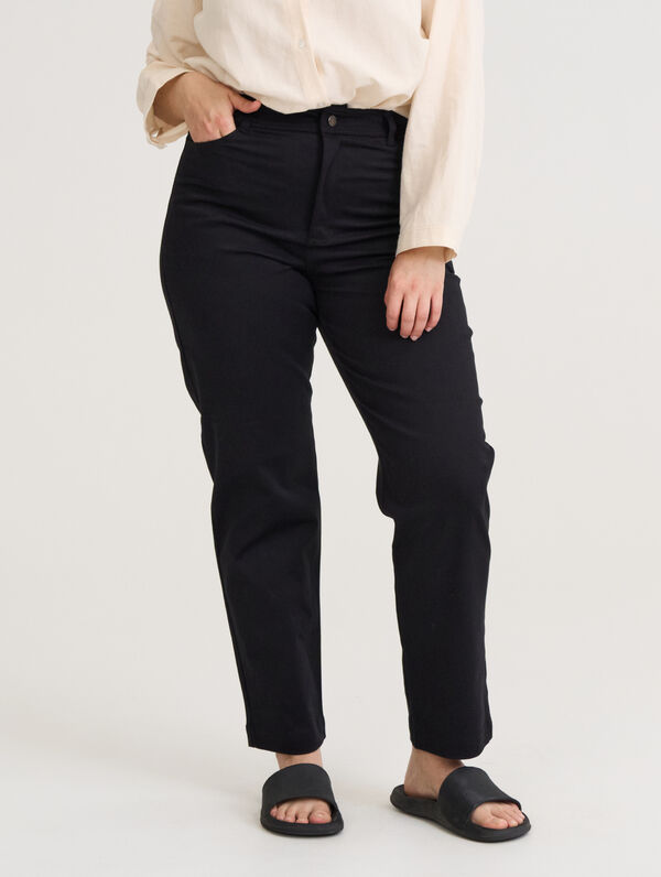 Jutta-housut ovat joustavaa puuvillasekoitetvilliä. Suorat ja vajaamittaiset lahkeet. Korkea vyötärö ja edessä napillinen vetoketjusepalus. Taskut edessä ja takana.