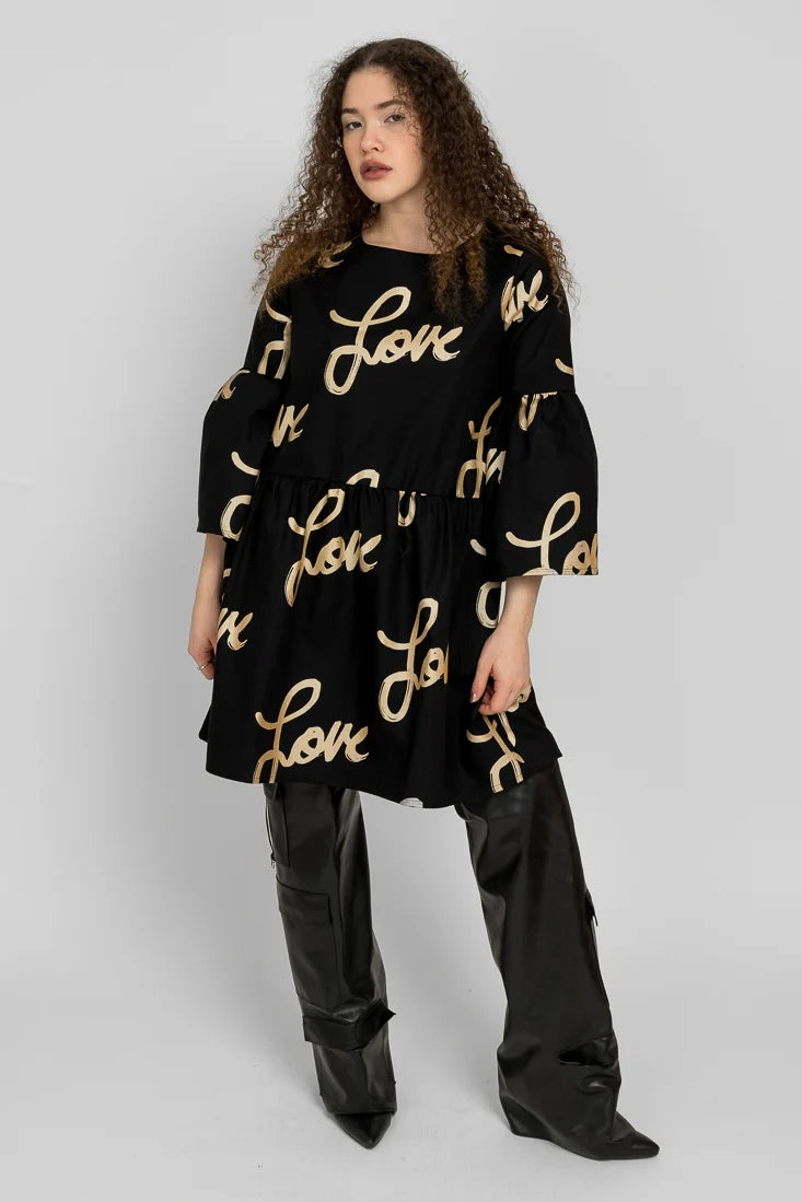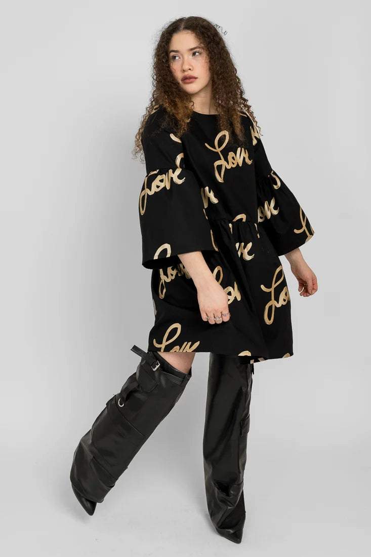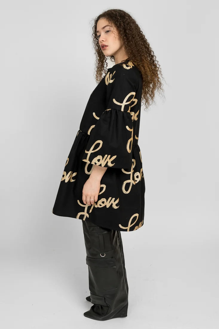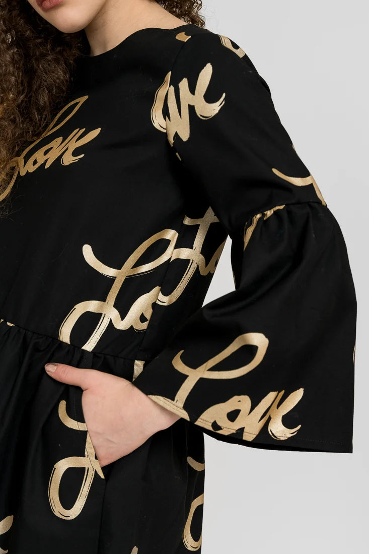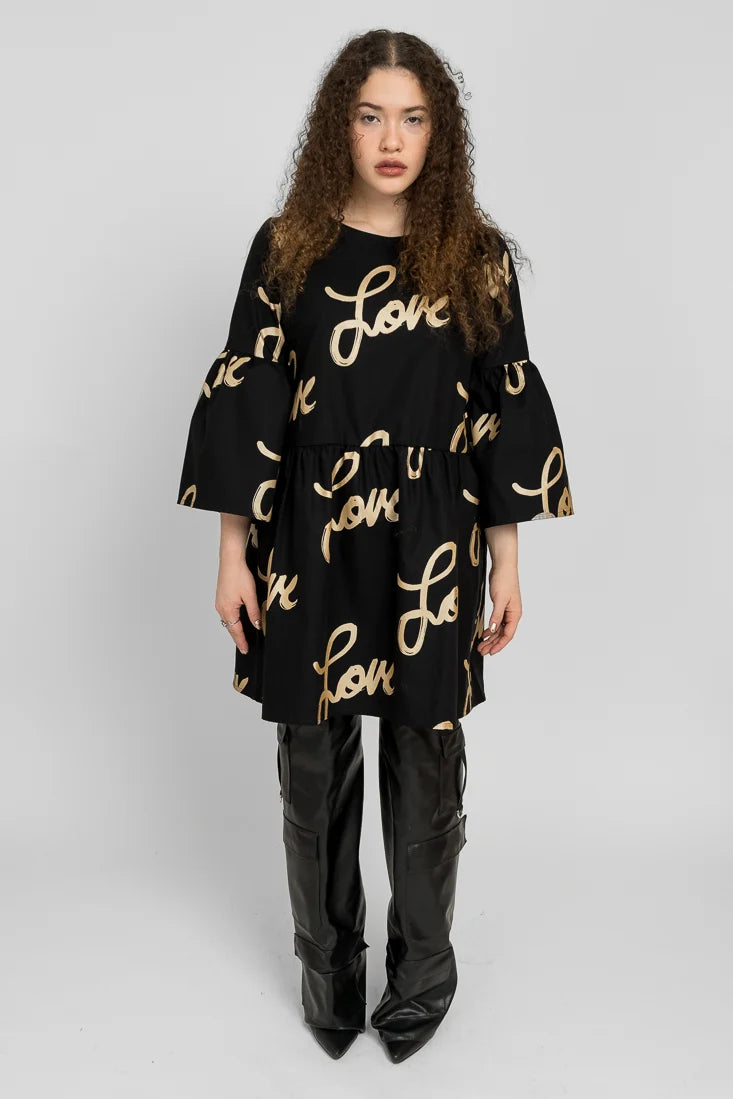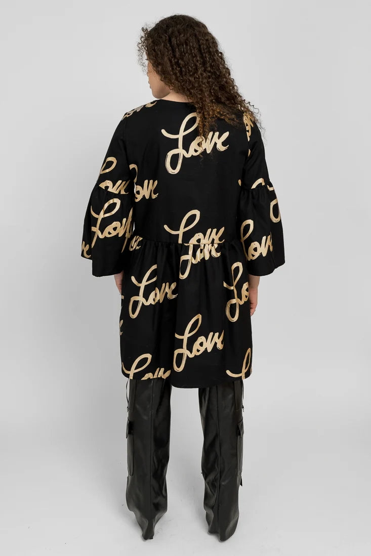 Tämä mekko on valmistettu ryhdikkäästä puuvillatwill -kankaasta. Kangasta koristaa Suomessa painettu kultainen Love-kuvio, jonka on suunnitellut Maija Louekari.