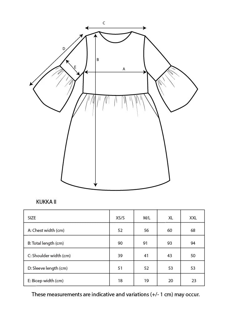 KUKKA II on tunikamekko, jossa on frillat hihoissa ja helmassa. Hameosassa on sivutaskut. Mekkoa on helppo käyttää ympärivuotisesti: kylmemmällä säällä voit pukea mekon kanssa farkut ja neuleen, kesällä kevyt mekko käy hyvin tennareiden kaveriksi. Kepeä, mutta samanaikaisesti vakavasti otettava työ- ja juhlavaate.