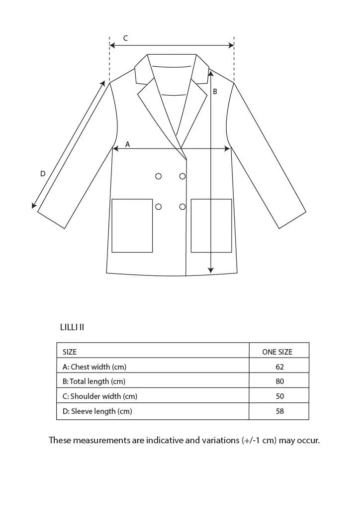 LILLI II on alkuperäisestä Lillistä uusi versio. Lilli II on enemmän oversize ja siluetiltaan skarppi. Tässä bleiserissä on olkatoppaukset, sekä edessä tuplanapitus ja taskut. Bleiserin voi yhdistää vaikkapa hameeseen tai farkkuihin, sillä Lilli II on monikäyttöinen takki ja toimii asussa kuin asussa. Luo näyttävä asukokonaisuus yhdistämällä Lilli II samasta materiaalista valmistettuihin Aina-housuihin.
