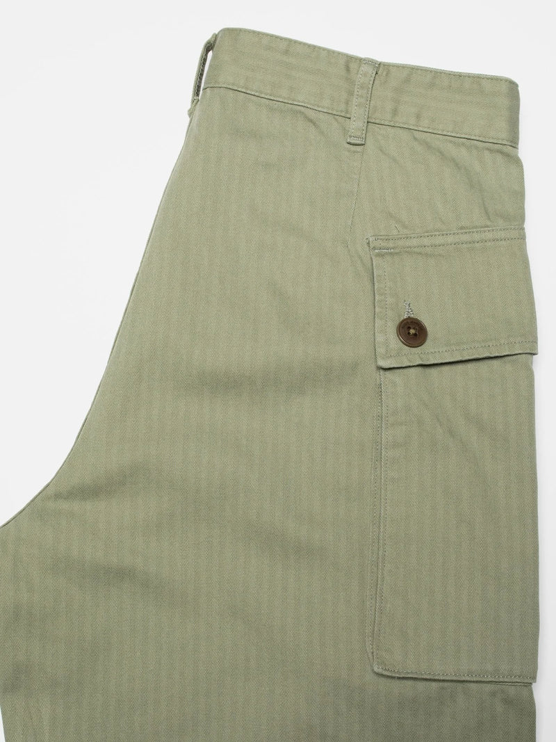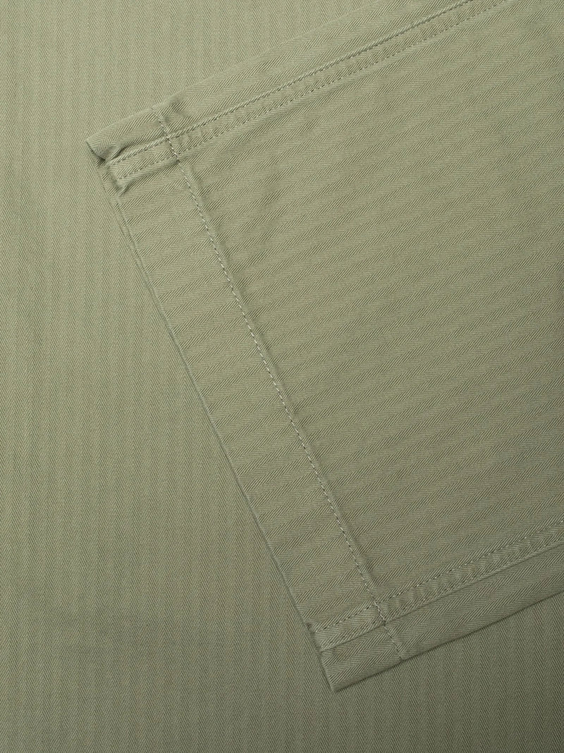 The Loud Larry pants feature a loose fit, wide leg, and comfortable high waist, staying true to the essence of authentic workwear. They are crafted from exquisite herringbone twill fabric. Its tightly woven construction gives it a slightly crisp texture, a dry feel, and a smooth appearance. The fabric pattern pays homage to vintage herringbone twills, and to ensure longevity and desirable aging property, we have piece-dyed it in a perfect sage green shade. The pants have undergone a gentle wash, subtly accentuating the fabric's characteristics and garment construction.