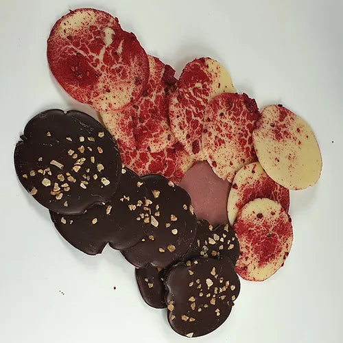 ”Kerjäläiset” on oiva tapa maistella viisi eri suklaalaatua. Tumma 70%, maito, ruby, kulta ja valkosuklaa on paketoitu kauniisti samaan pakettiin. Tumman suklaan päälle on ripoteltu paahdettua mantelia, valkosuklaa on kuorrutettu kuivatulla vadelmalla ja maito, ruby & kultasuklaa ovat herkullisia sellaisenaan. Täydellinen seuralainen kahvihetkeen.