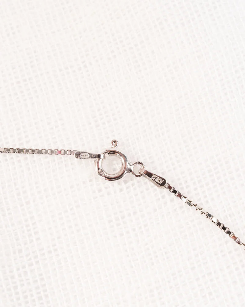 Ketju ja muut metalliosat 925 sterling-hopeaa rhodium-pinnoitteella, valmistusmaa Italia.