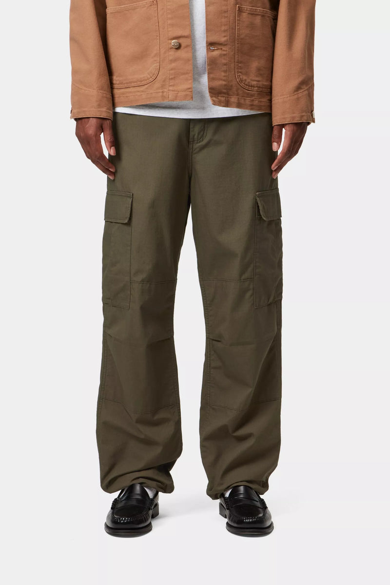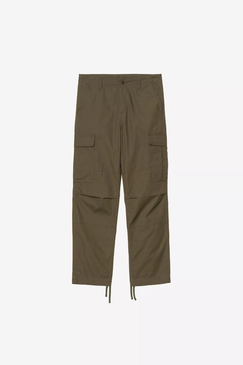 The Regular Cargo Pant is made of midweight cotton Columbia ripstop, which has been rinsed for a softer feel. The style is cut in a regular fit with a low waist and features double-layer knees, adding to its robust qualities. Multiple pockets throughout nod to the garment's military-style influences, and tie detailing at the cuffs allow for the fit to be adjusted.