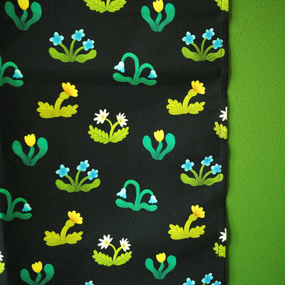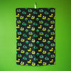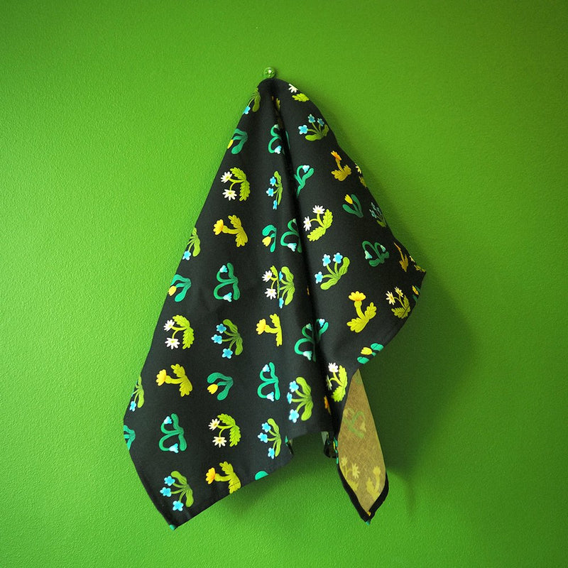 An illustrated kitchen towel with a mushroom design.