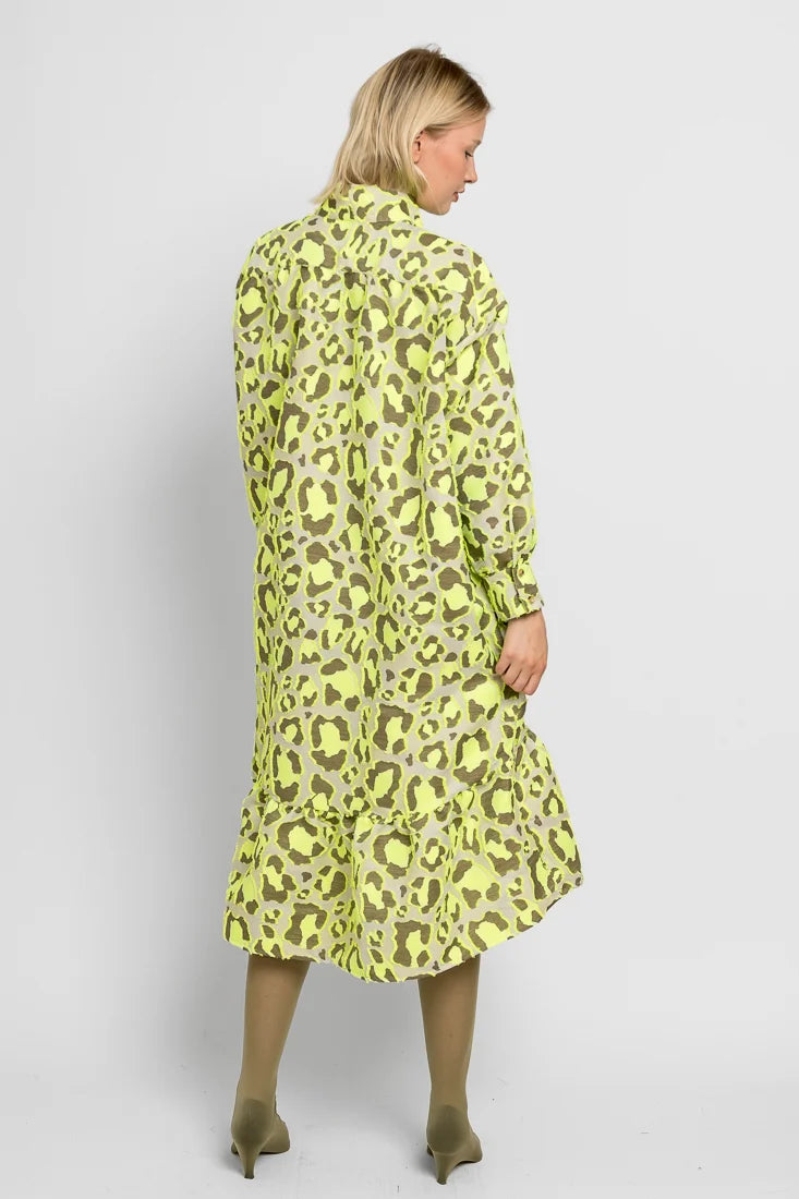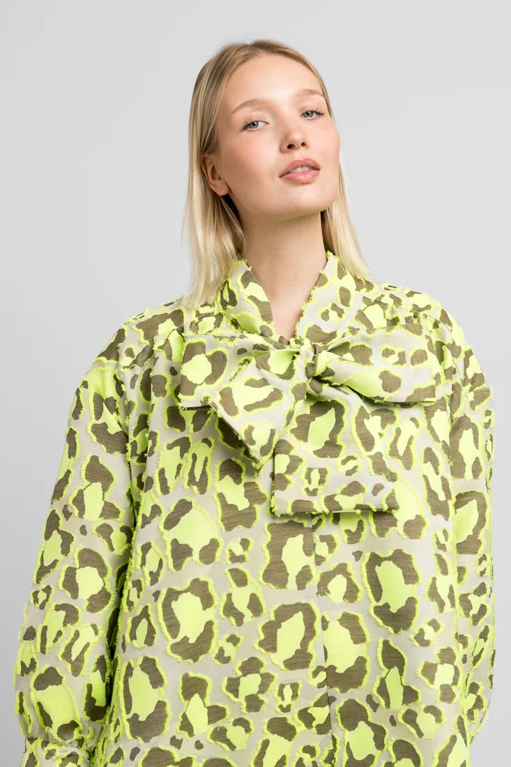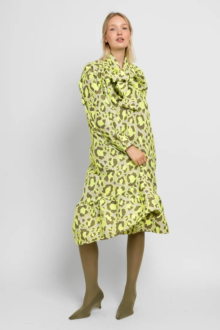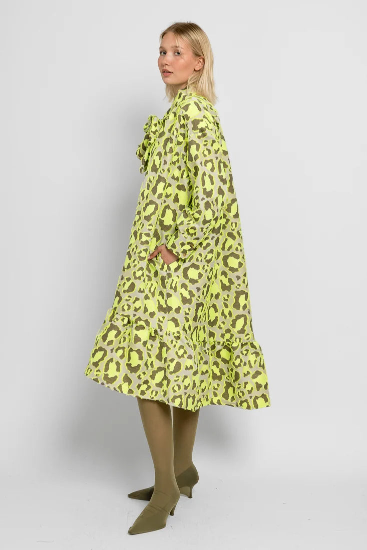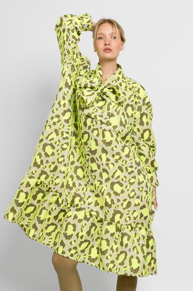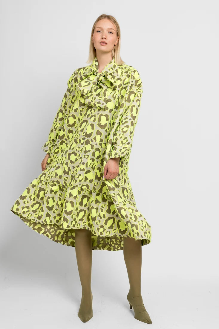 Mekon materiaalina on vaaleapohjainen kudottu jacquard-kangas, jossa on neonvihreitä hapsuilla reunustettuja leopardin täpliä. Kangas on valmistettu Ranskassa.