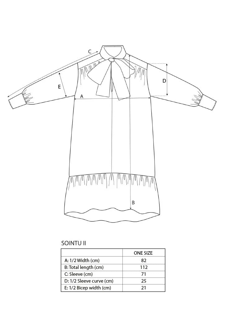 SOINTU II on ihana katseenvangitsija joka tilanteeseen. Pääntiellä on leikkisä rusettikiinnitys ja hihoissa napilliset rannekkeet. Sointu II on väljä malli, joka istuu monenkokoiselle käyttäjälle. Tähän mekkoon haluaisit sujahtaa aina – oli tiedossa sitten työ- tai kotoilupäivä.