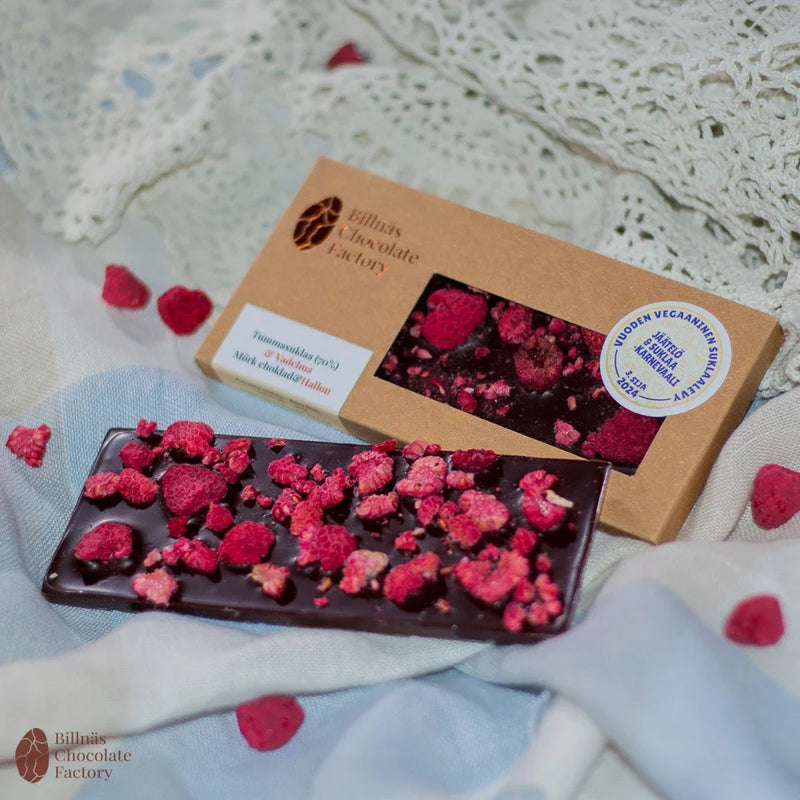 Ainesosat:Kaakaomassa (vähintään 70%), kaakaovoi,sokeri, emulgointiaine: SOIJAlesitiini , luonnollinen vanilja-aromi, kuivatut vadelmat. Säilytä kuivassa paikassa, auringonvalolta suojattuna, 12C -20C välillä.