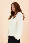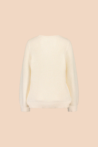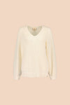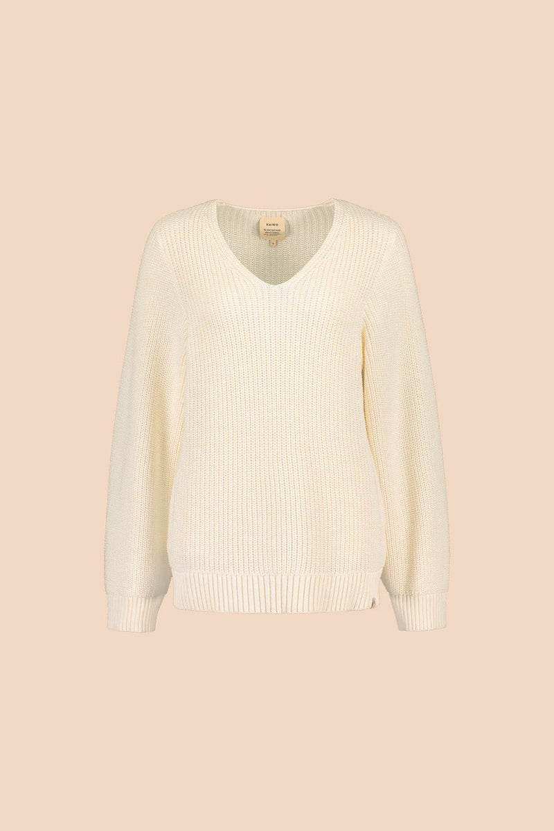Paksuhko V-neck Jumper -puuvillaneule on materiaaliltaan 100% luomupuuvillaa. Neuleessa on v-pääntie, istuva olka ja täyspitkät leveähköt hihat. Helmassa ja hihansuissa on resorineulos. Malliltaan neule on rento ja väljä. Sävynä ajaton luonnonvalkoinen.